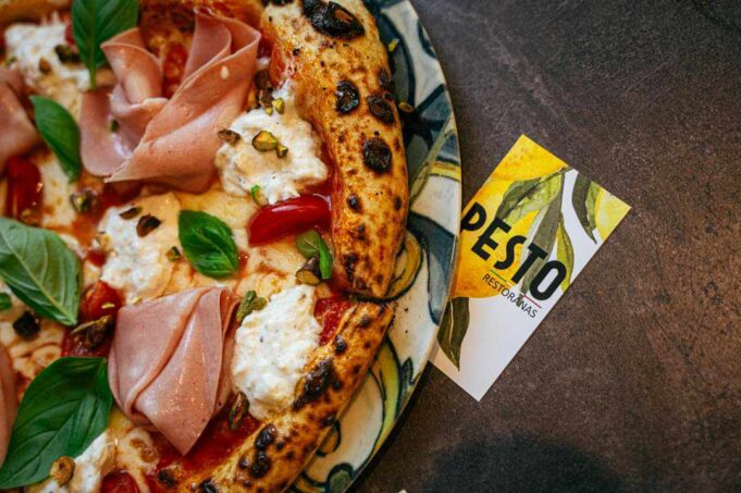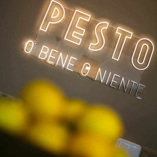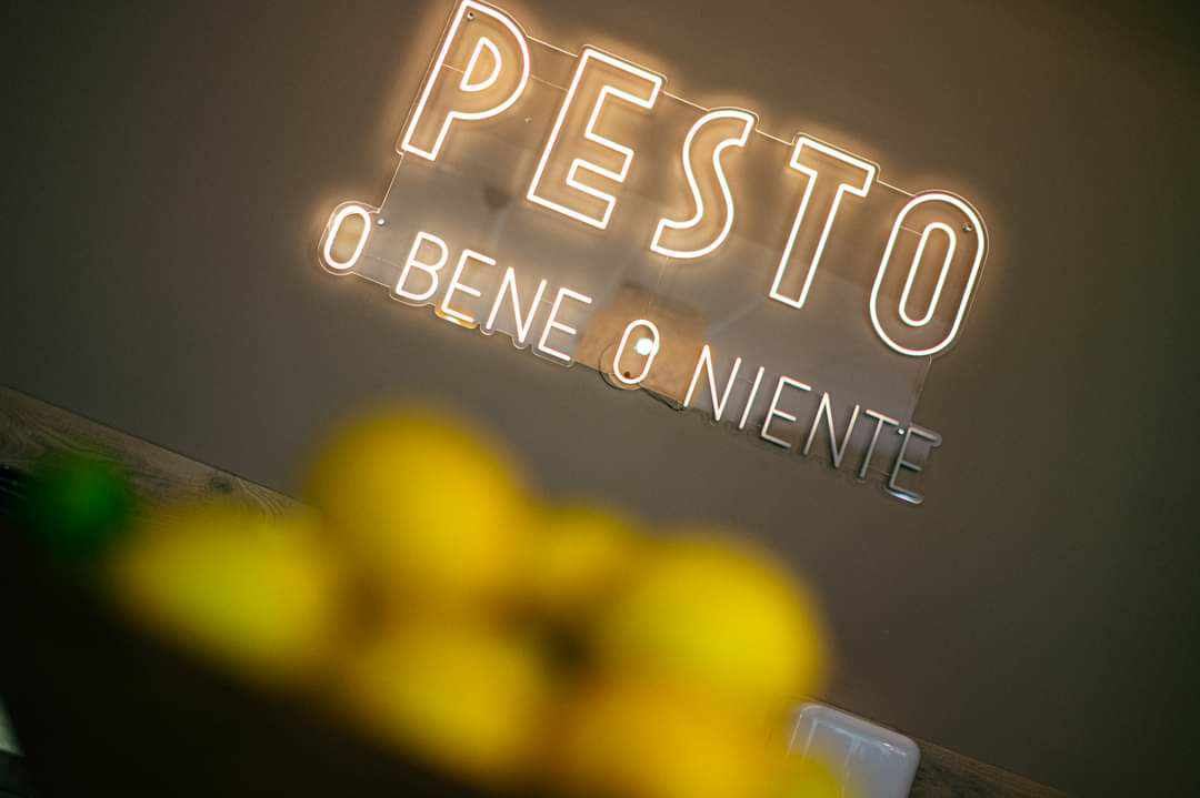 Restoranas dirba iki dešimtos vakaro. Svarbiausias maistas, aišku, yra picos, kurios kepamos iš keturiasdešimt aštuonias valandas brandintos tešlos. „Pirmą dieną vakare pritrūkom tos jau subrandintos tešlos. Kadangi mūsų šūkis „Gerai arba nieko“, savo sąskaita vaišinom svečius makaronais. Jie restorane – savos gamybos, o produktai apskritai visi itališki – ir kumpiai, ir dešros, ir miltai, ir sūriai. L. Viduolytė-Pupelienė sakė, kad surinkta nauja restorano komanda mokėsi gaminimo paslapčių iš trijų labai patyrusių italų šefų Matteo, Mario ir Marco. Kad būtų aiškiau, kas ta patirtis – vienas jų yra dirbęs vienos, dviejų ir trijų žvaigždučių „Michelin“ restoranuose. „Pesto“ komanda – nauja, tik pirmas dienas naujokams suktis padėjo keli žmonės iš „Pupelės“.
