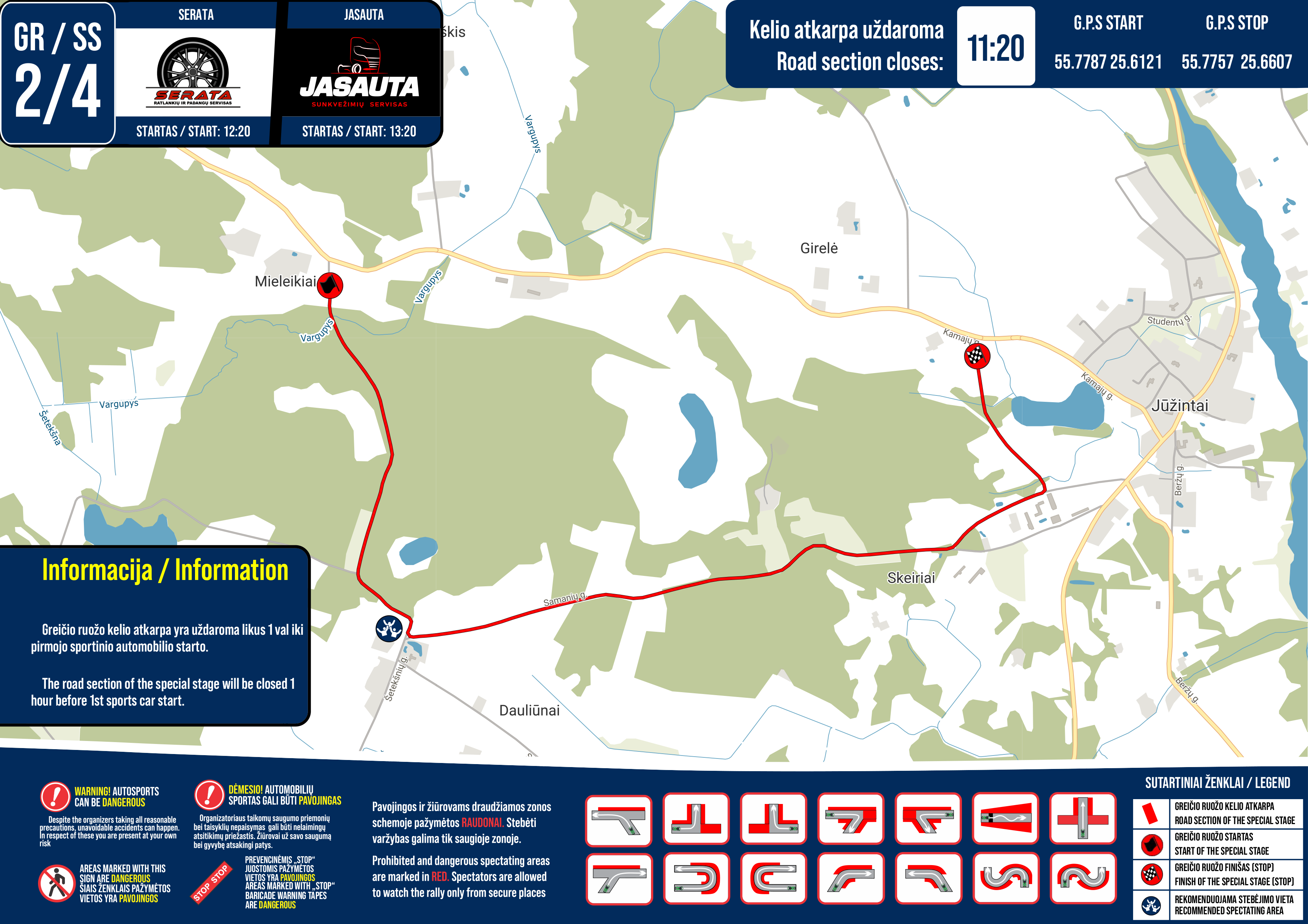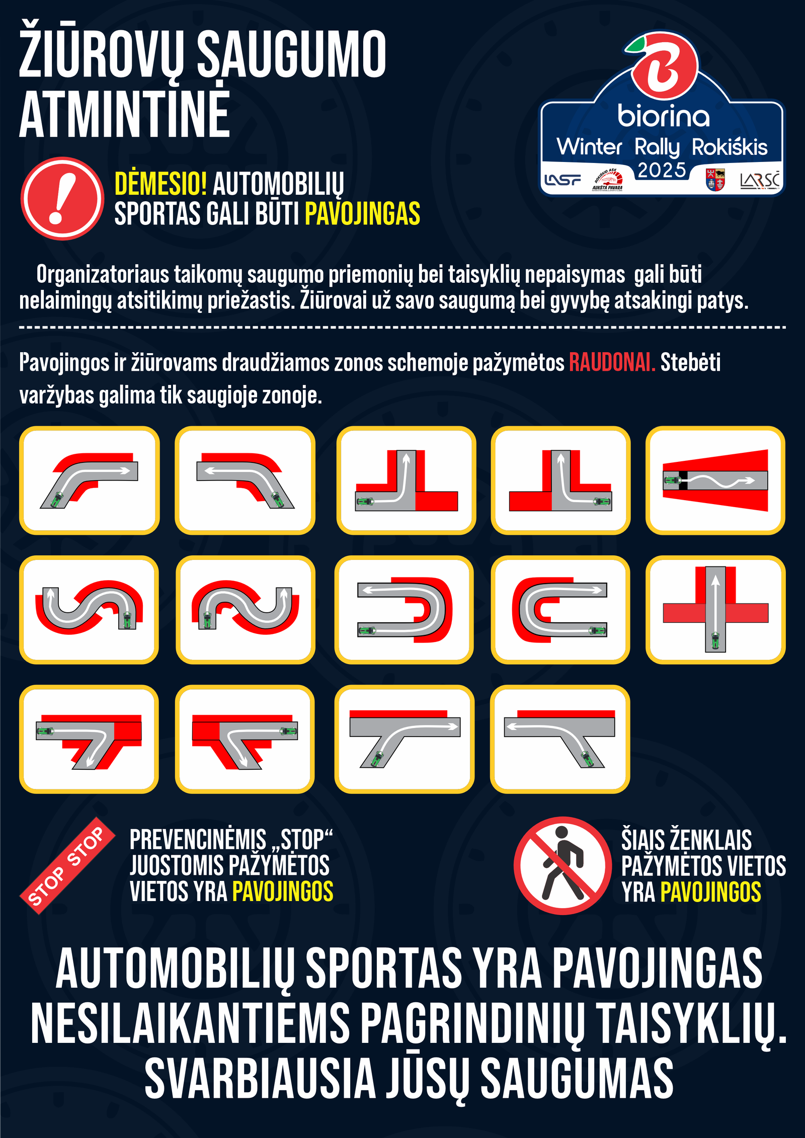 Taip pat primename pagrindines saugaus varžybų stebėjimo taisykles: niekada nestovėkite išorinėje posūkio pusėje, nesiartinkite prie vietų, kurios pažymėtos ženklais „pavojinga zona“, visada likite už tvoros, STOP juostos ar kitokių atitvėrimų, nesėdėkite ir nebūkite toje vietoje, iš kurios negalėtumėte greitai pasišalinti, bei niekada nevaikščiokite po trasą vykstant varžyboms.