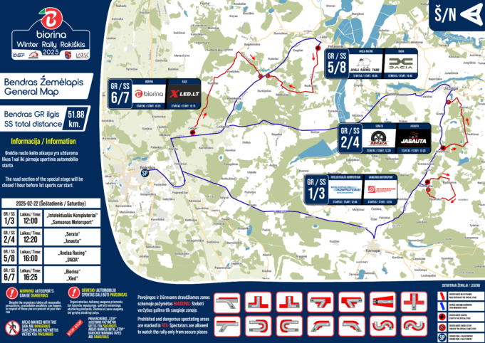 „Biorina Winter Rally Rokiškis“ sportinė dalis startuoja šeštadienį. Dalyvių laukia keturi greičio ruožai, kurie bus važiuojami po du kartus. Varžybos startuos Rokiškio Sąjūdžio aikštėje 11.30 val. Iš ten dalyviai pajudės į pietus, link Utenos, kur lauks du beveik identiško ilgio greičio ruožai. GR/SS „1“ – „Intelektualūs kompiuteriai“ bei GR/SS „3“ – „Samsonas Motorsport“ – startuoja ir finišuoja tame pačiame Kamajėlių kaime bei apsuka 5.40 km ilgio lanką per Radžionis. Visai šalia įsikūręs ir GR/SS „2“ – „Serata“ bei GR/SS „4“ – „Jasauta“ greičio ruožas, kuris startuoja Mieleikiuose ir penkis su puse kilometro vingiuoja link Jūžintų. Šiame miestelyje įsikurs ir dalyvių persigrupavimo zona.