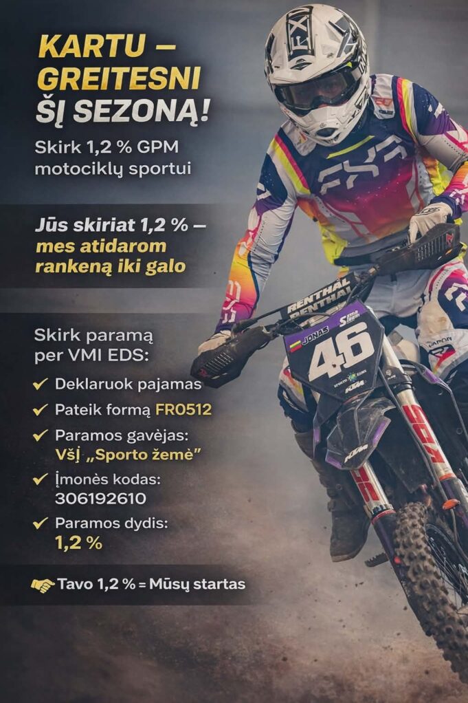 Artėjant naujam motociklų sporto sezonui, greičio ir adrenalino gerbėjai telkiasi bendram tikslui. Organizacija VšĮ „Sporto žemė“ kreipiasi į visuomenę, kviesdama prisidėti prie šios sporto šakos plėtros bei sportininkų meistriškumo augimo, skiriant 1,2 proc. gyventojų pajamų mokesčio (GPM) paramą.