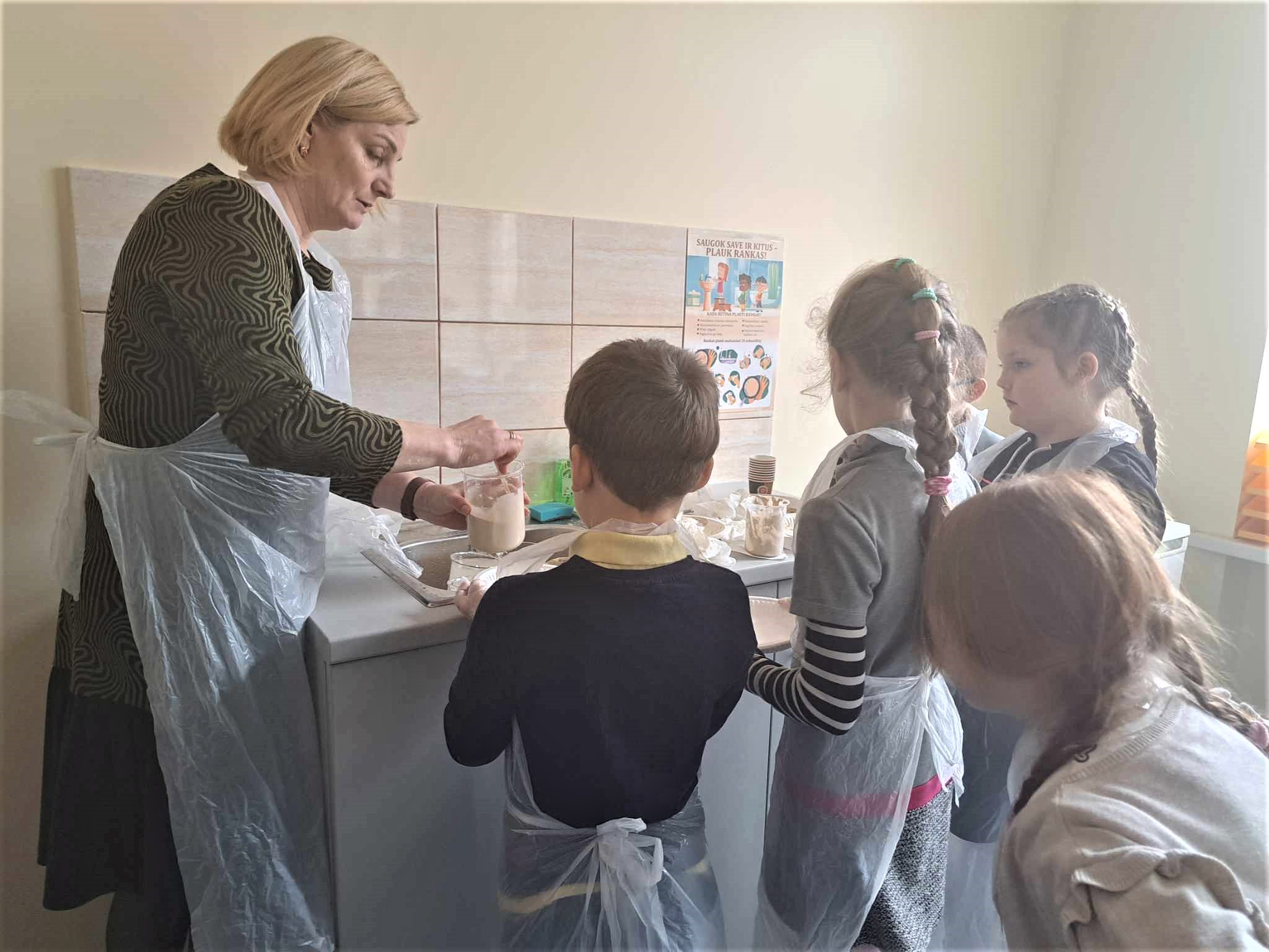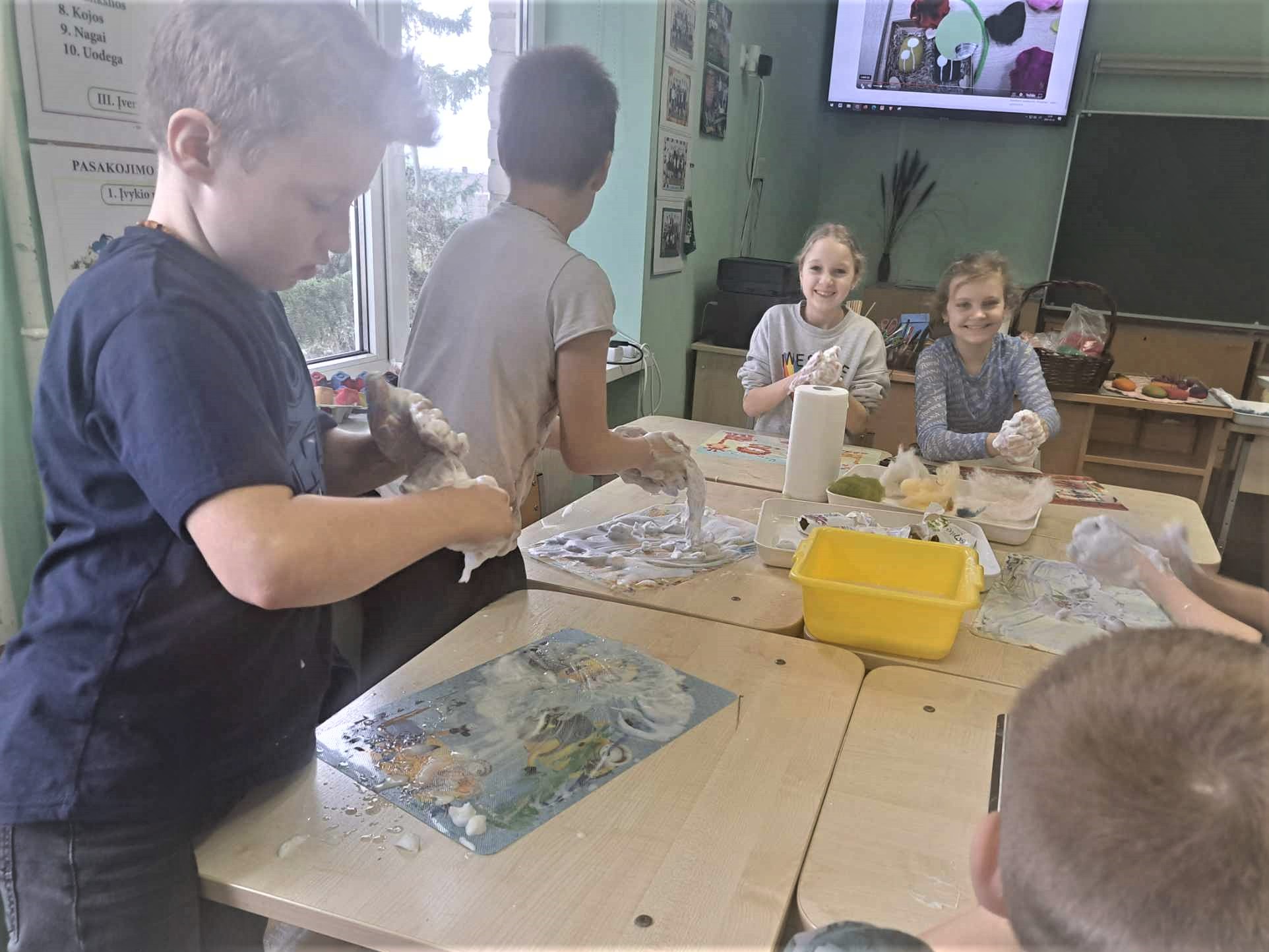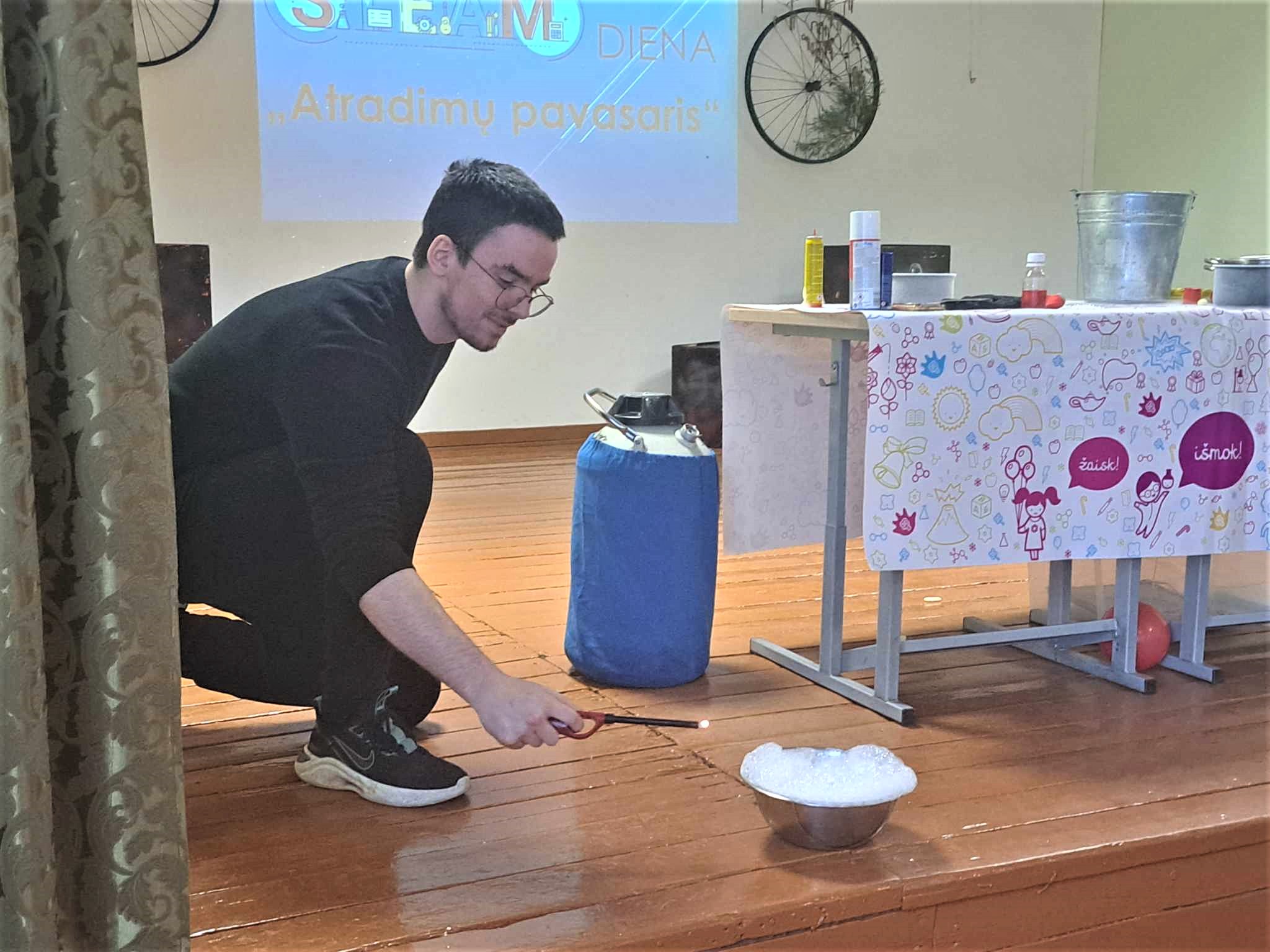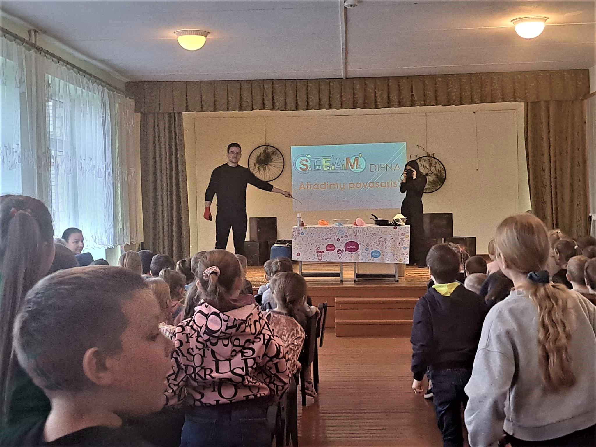 Mokytoja Daiva Girdvainienė demonstravo ir patiems leido pasigaminti tikrą karamelę, o ketvirtokai mokėsi velti vilną kartu su mokytoja Ramute Vaičėniene. Svečiams iš Noriūnų mokytoja Renata Kiburienė pristatė gipso savybes. Vaikai iš gipso pasigamino savo delniukų antspaudus. STEAM dienos pabaigoje teiktos padėkos renginio dalyviams bei edukatoriams.