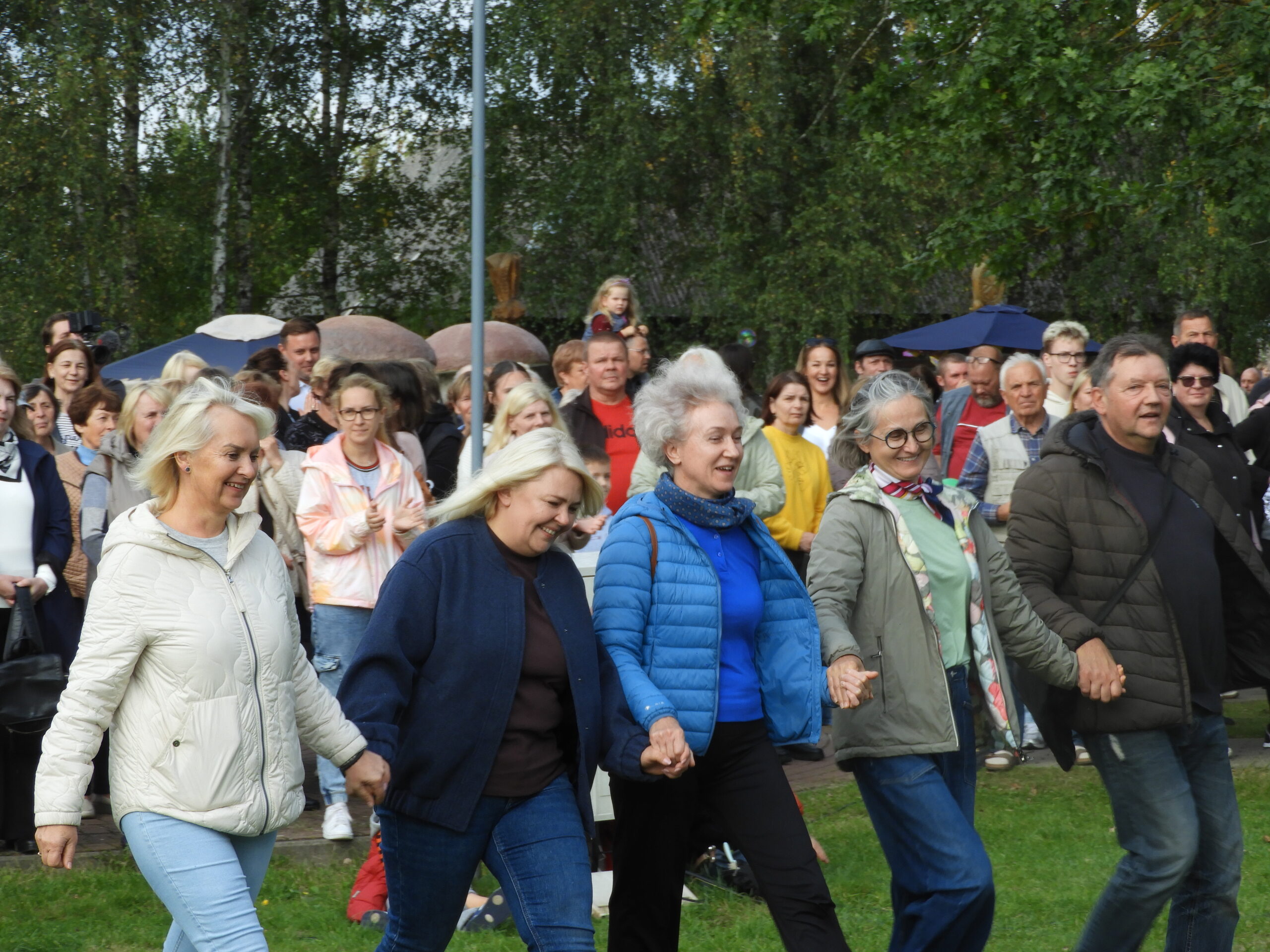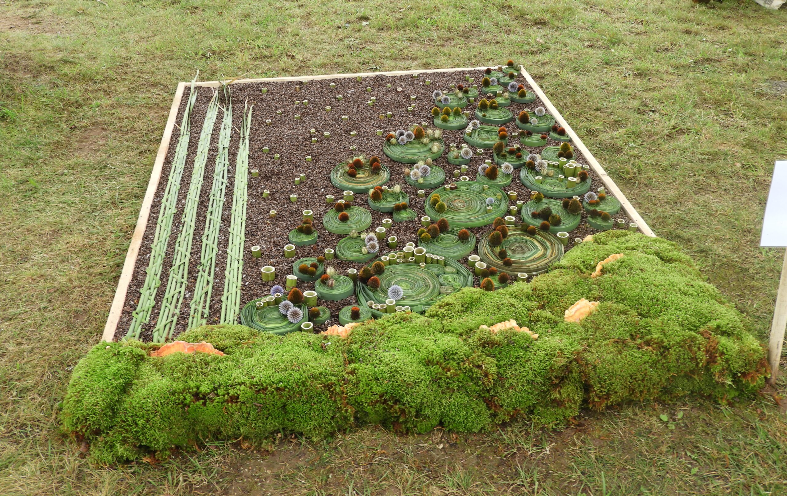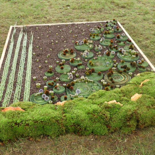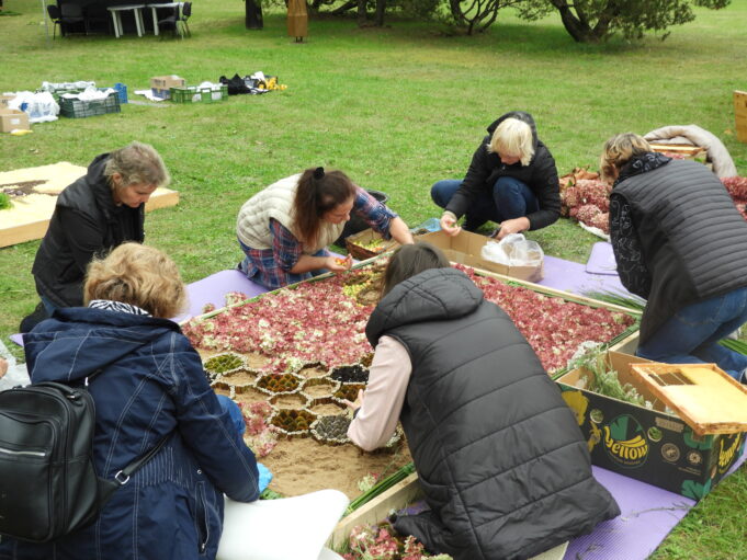 Ir dėliojo, komponavo po gabalėlį, žiedelį, samanėlę savo išmoningus kūrinius sutūpę, pusiaugulomis, vis atsistodami iš šalies pasižiūrėti, ar jau pakankamai gražu, ar viskas vyksta taip, kaip buvo sumanyta. Apie 12 valandą beveik visi kilimai buvo baigti, tik kai kuriuos kūrėjai vis dar bandė tobulinti ir gražinti, pataisydami vieną kitą detalę, įterpdami vienur kitur žiedelį ar obuoliuką.