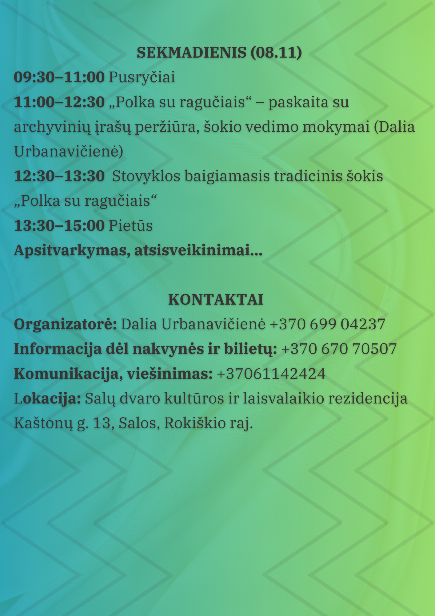 11:00–12:30 „Polka su ragučiais“ – paskaita su archyvinių įrašų peržiūra, šokio vedimo mokymai (Dalia Urbanavičienė)