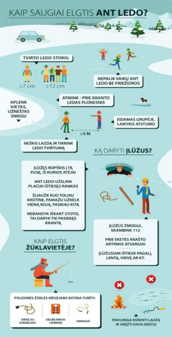 Ugniagesiai gelbėtojai primena, kad užšalę vandens telkiniai kelia didelį pavojų, ypač ankstyvuoju žiemos laikotarpiu. Net ir vizualiai tvirtas ledas ne visada yra saugus – jo storis gali būti nevienodas, o vietose, kur yra srovės, šaltiniai, augmenija ar įteka upeliai, ledas dažnai būna netvirtas.