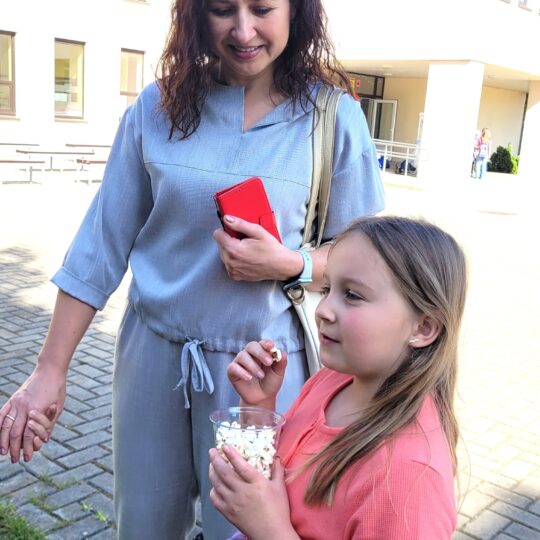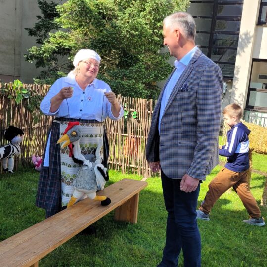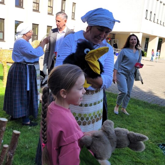 Juos pasitiko spalvingas „Bobutės kiemelis“, siūlantis susipažinti su teatro lėlėmis. Pažinti įvairius pasakų personažus mažyliams padėjo Bajorų lėlių teatras ČIZ.
