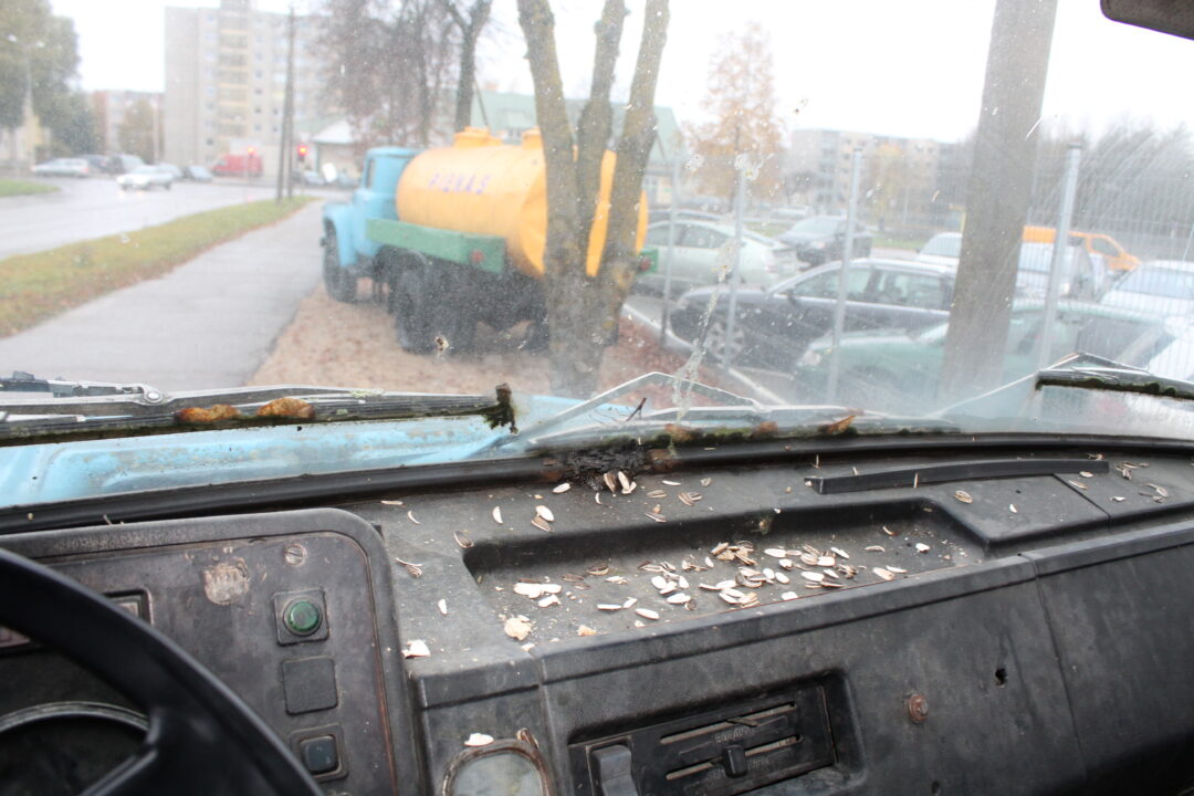 Išdaužti pienovežių GAZ53 ir VOLVO langai, sudaužyti veidrodėliai, įsibrauta į vidų ir, matyt, ilgokai sėdėta bei vaišintasi, nes „svečiai“ nepasikuklino palikti saulėgrąžų lukštų krūvelių, sausainių likučių. Gal švęstas Helovinas?