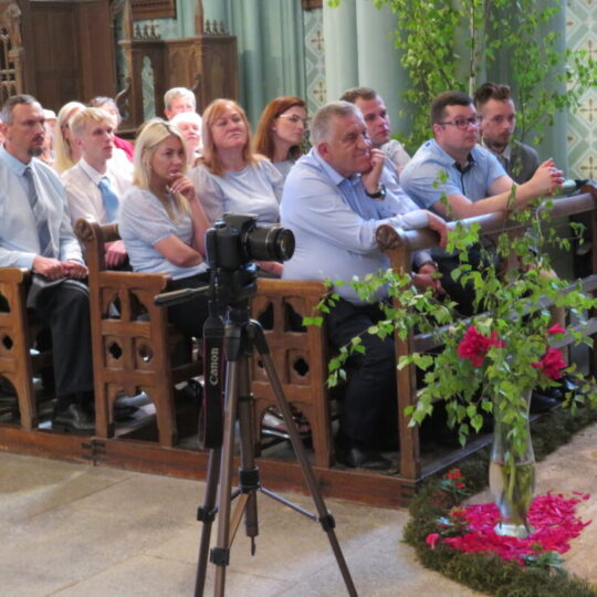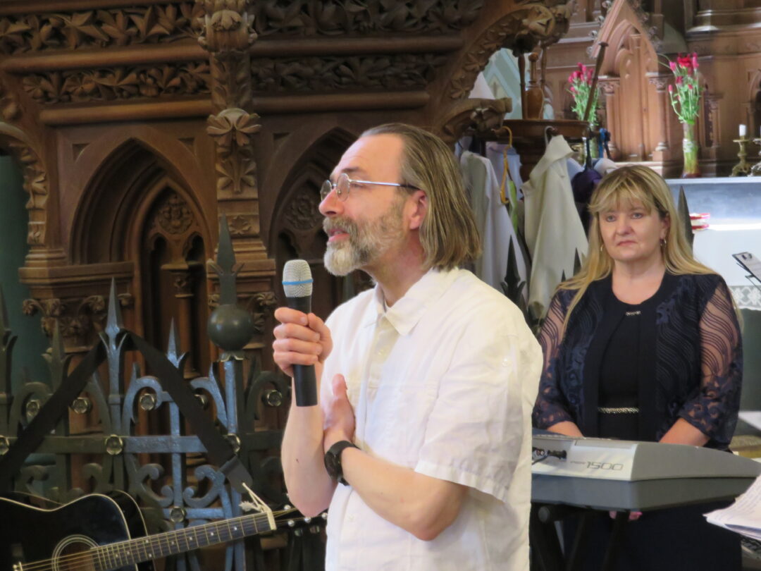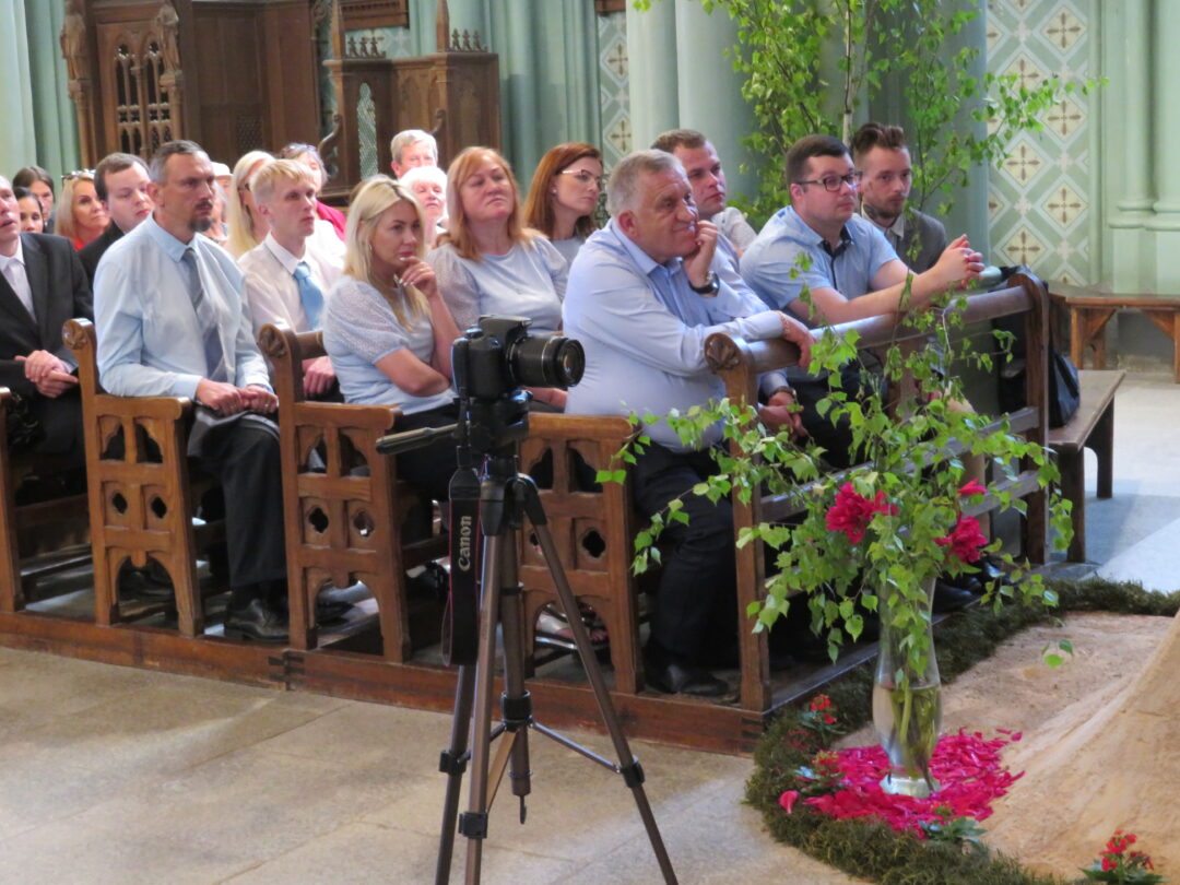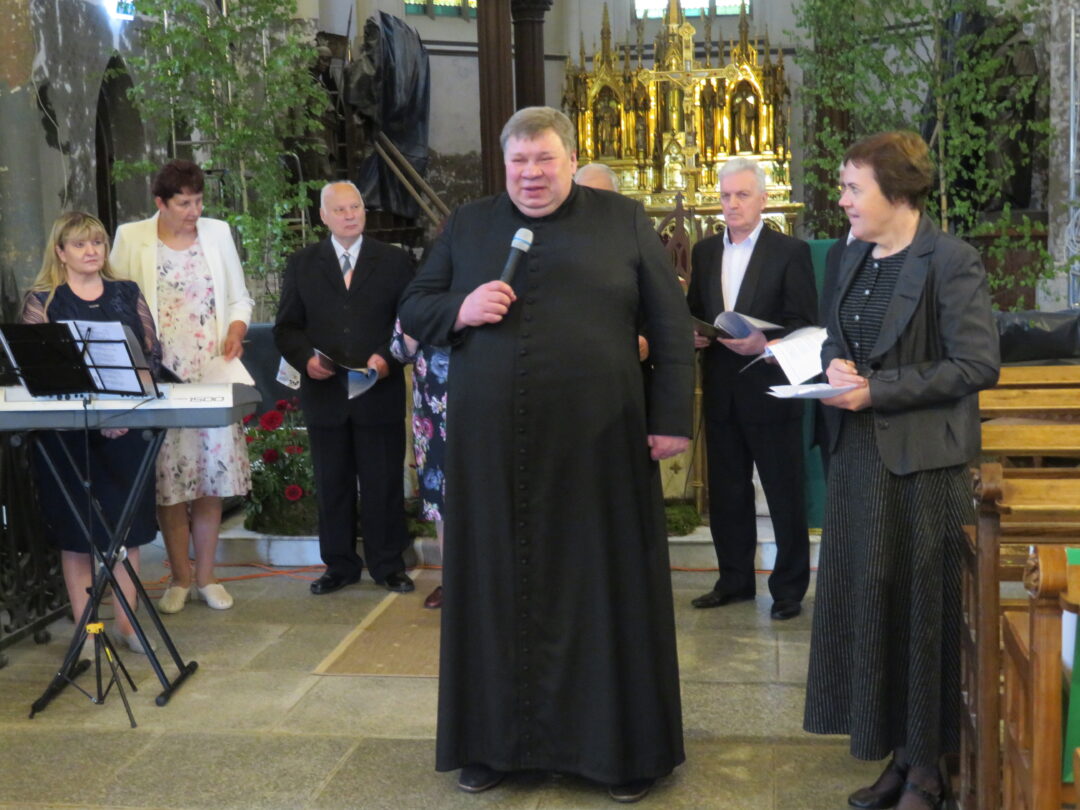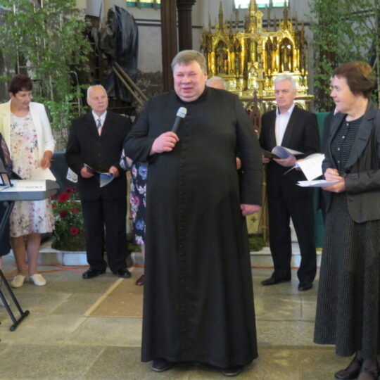 Dalyvius sveikino viena šventės įkvėpėjų Nida Lungienė, Rokiškio dekanato dekanas Eimantas Novikas bei šventės globėjas, Obelių parapijos klebonas Laimonas Nedveckas.