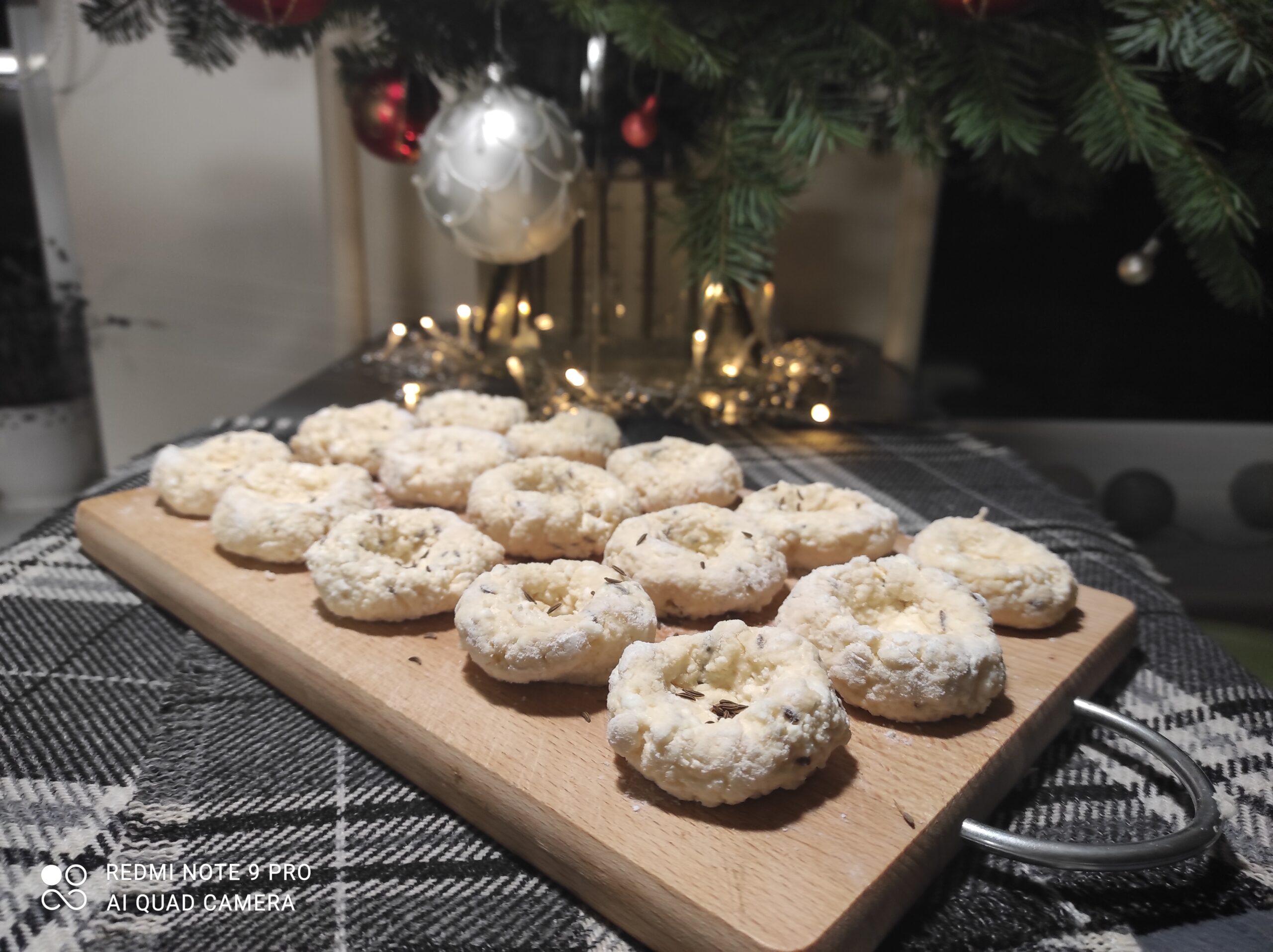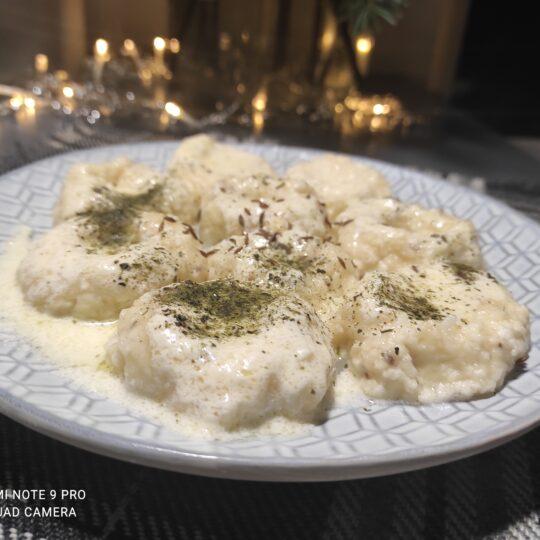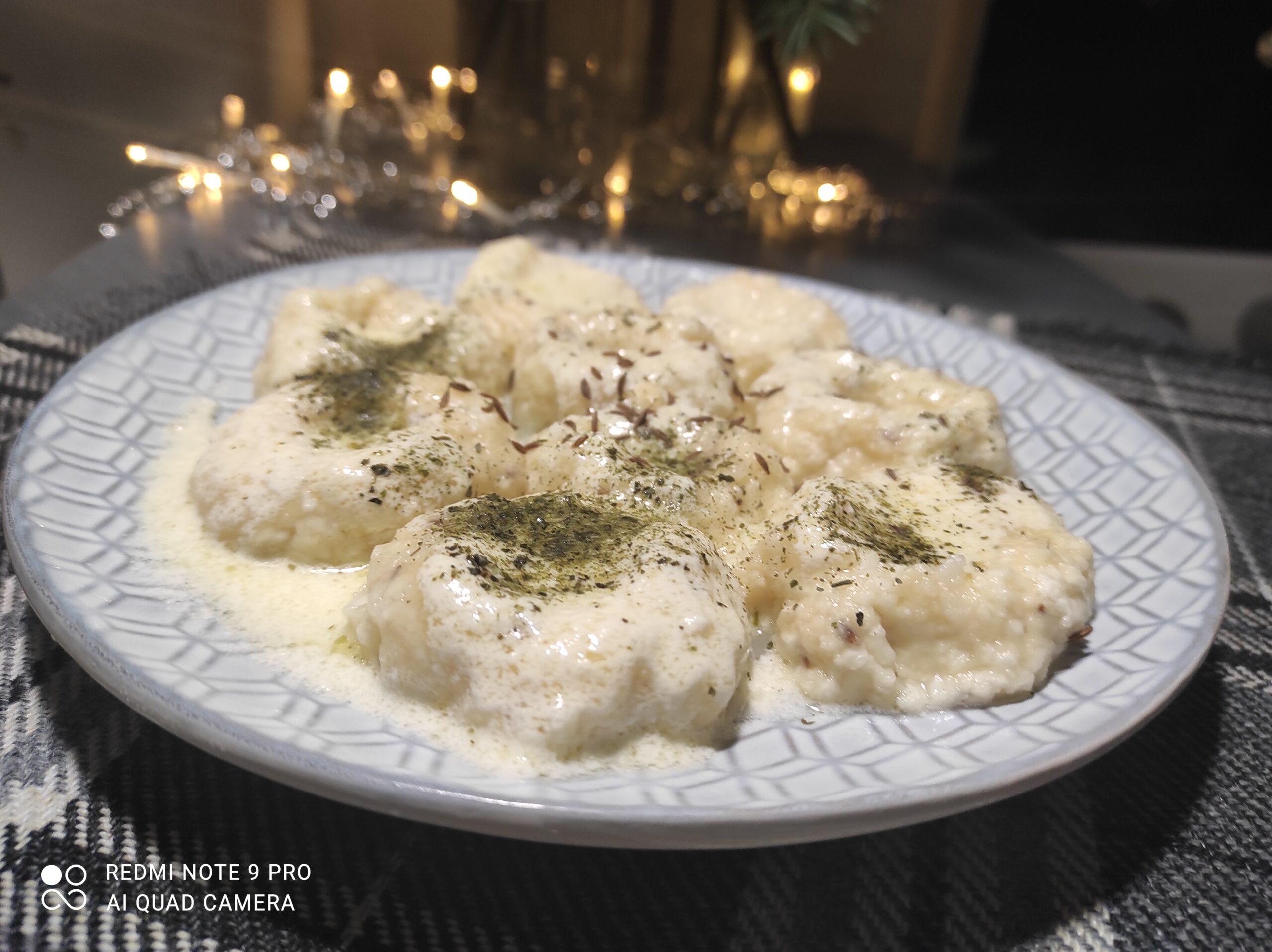 Kmynus nuplikyti verdančiu vandeniu, palaikyti apie 10 min. Česnakus smulkiai sukapoti. Iš varškės, kiaušinių, miltų minkyti tešlą, berti kmynus, česnakus, gardinti druska ir cukrumi. Viską suminkyti. Formuoti pusės šaukšto dydžio burbuliukus, šiek tiek paploti ir suformuoti per vidurį duobutę (na, kaip dubenėlį tam, kad padažas jame užsilaikytų). Virti pasūdytame vandenyje, kol iškils. Pasigaminti padažą, keptuvėje ištirpdyti sviestą, įmaišyti grietinę, gardinti druska ir pipirais (jei mėgstate, galite pakepti poro ar svogūno).