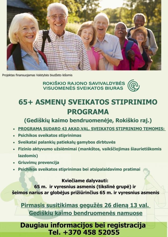 Liepos mėnesį toliau sėkmingai įgyvendinamas valstybės biudžeto fondo lėšomis finansuojamas 65 M. IR VYRESNIŲ ASMENŲ SVEIKATOS STIPRINIMO BENDRUOMENĖJE PROGRAMA, Gediškių kaimo bendruomenėje. Projektą įgyvendina Rokiškio rajono savivaldybės visuomenės sveikatos biuras.
