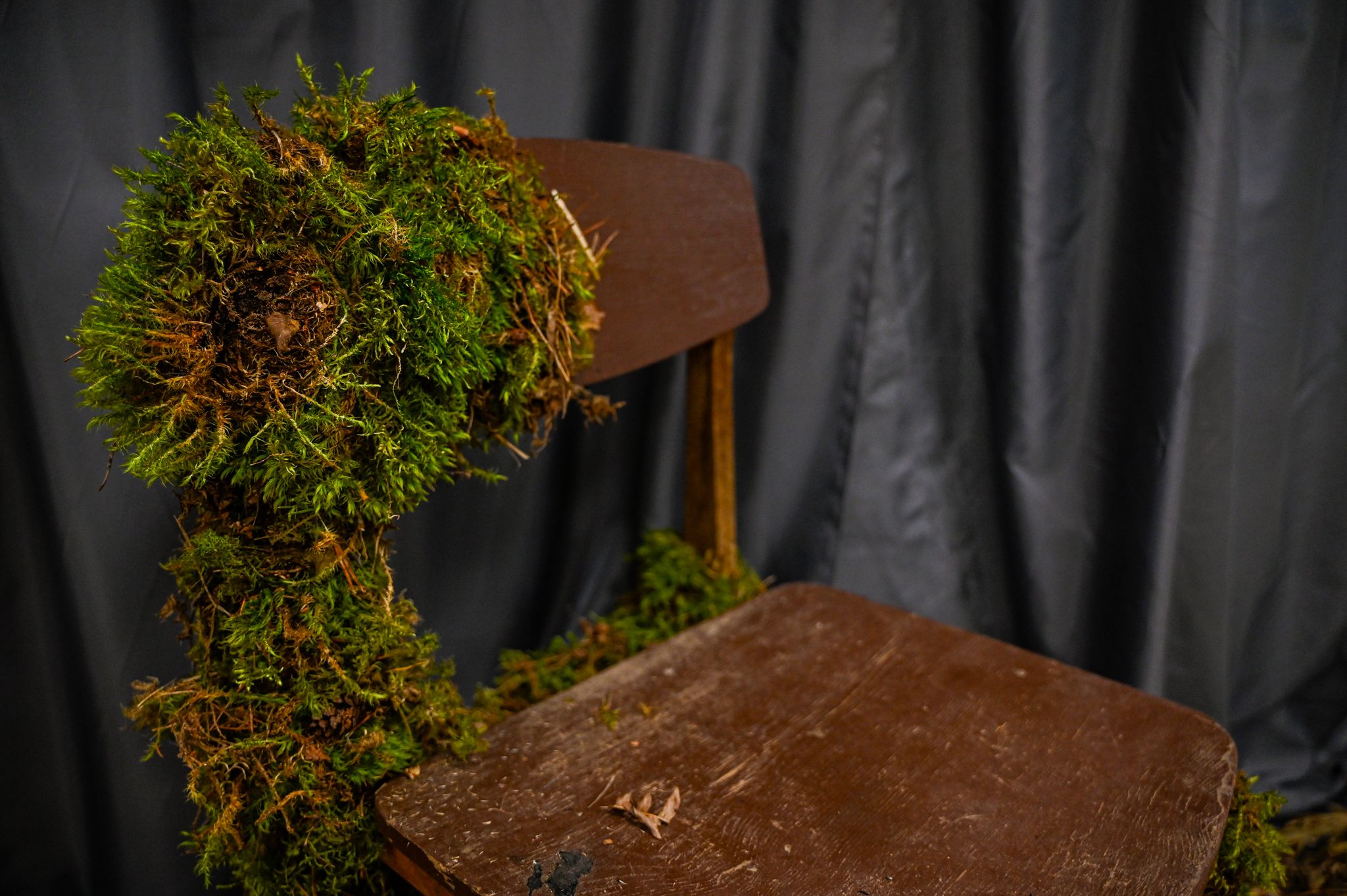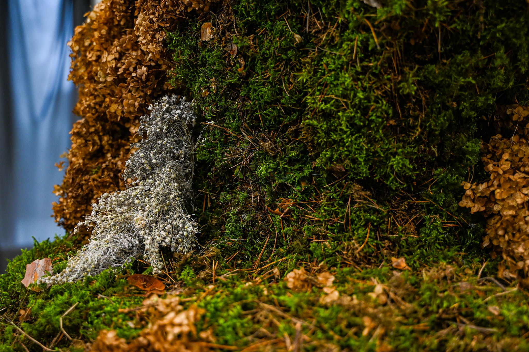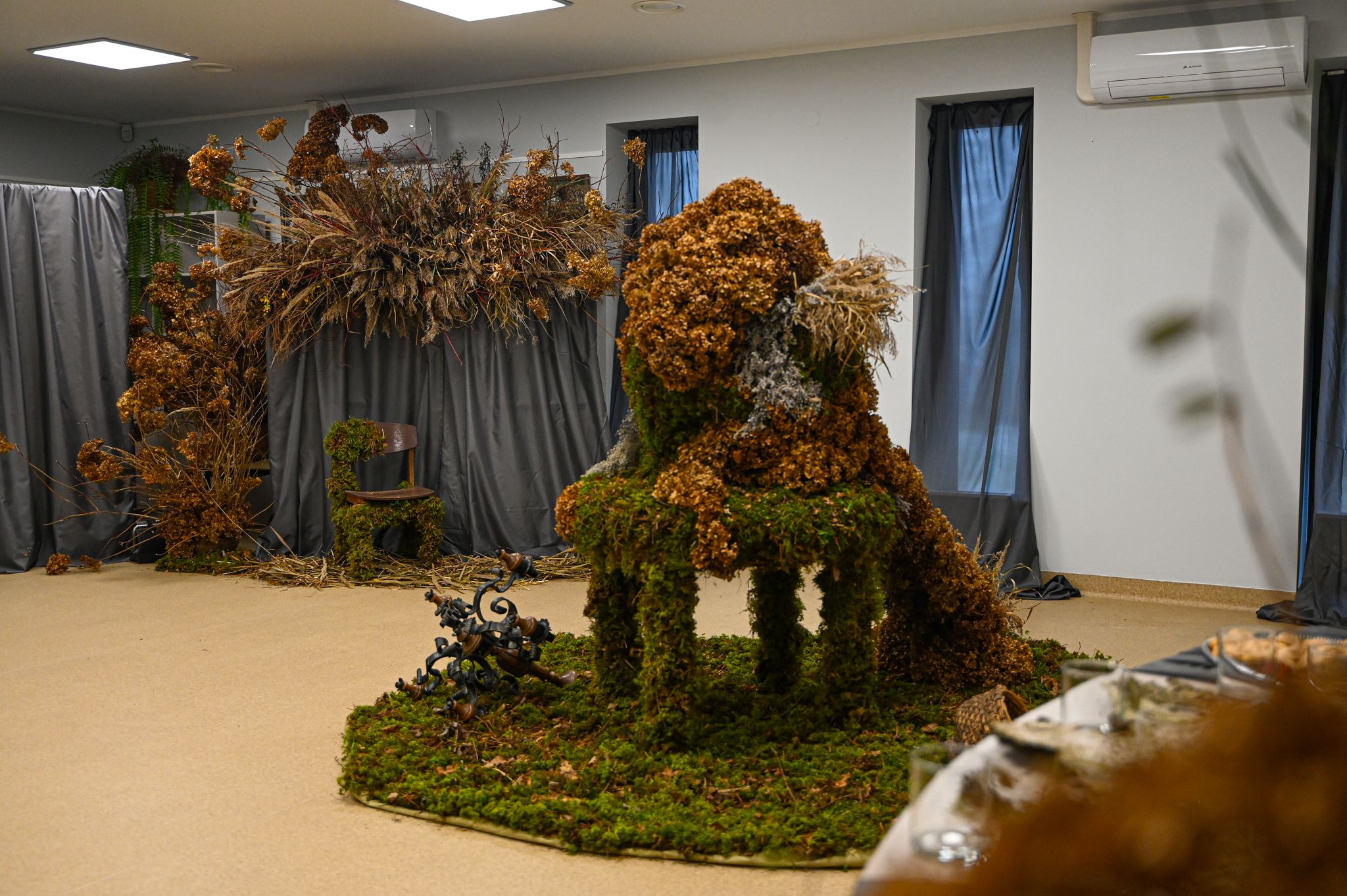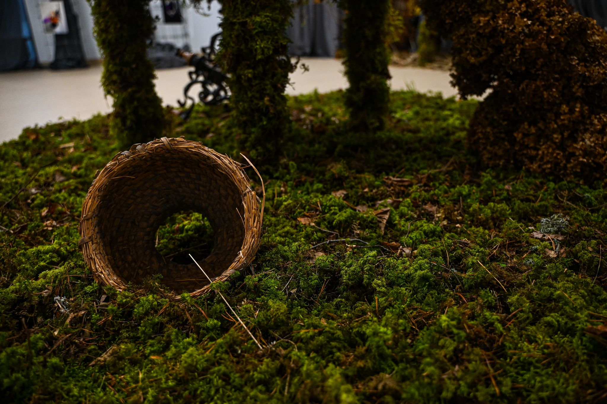 Ji sakė, kad instaliaciją sugalvojo visiškai spontaniškai ir per porą dienų vienoje iš bendruomenės salių ją sudėliojo kartu su Romu ir Daiva Kundeliais. Nors dirba su įvairiausiais pasaulio augalais, šimtais įvairiausių gėlių rūšių, šioje instaliacijoje jai mieliausia tai, kad absoliučiai viskas iš Obelių. Samanos, beržo tošis, obuoliai, lapai, smilgos, nurodavusios gėlės, kurias jau ketinta nupjauti, o kompozicijai puikiausiai tiko.