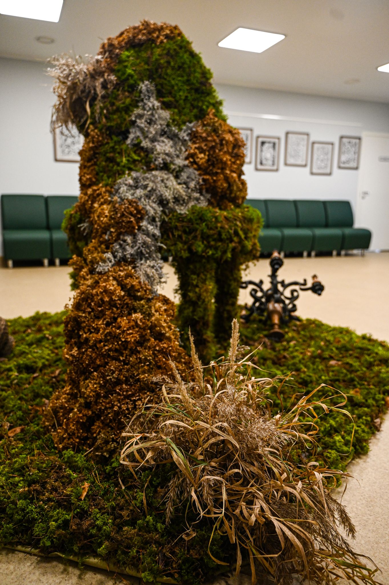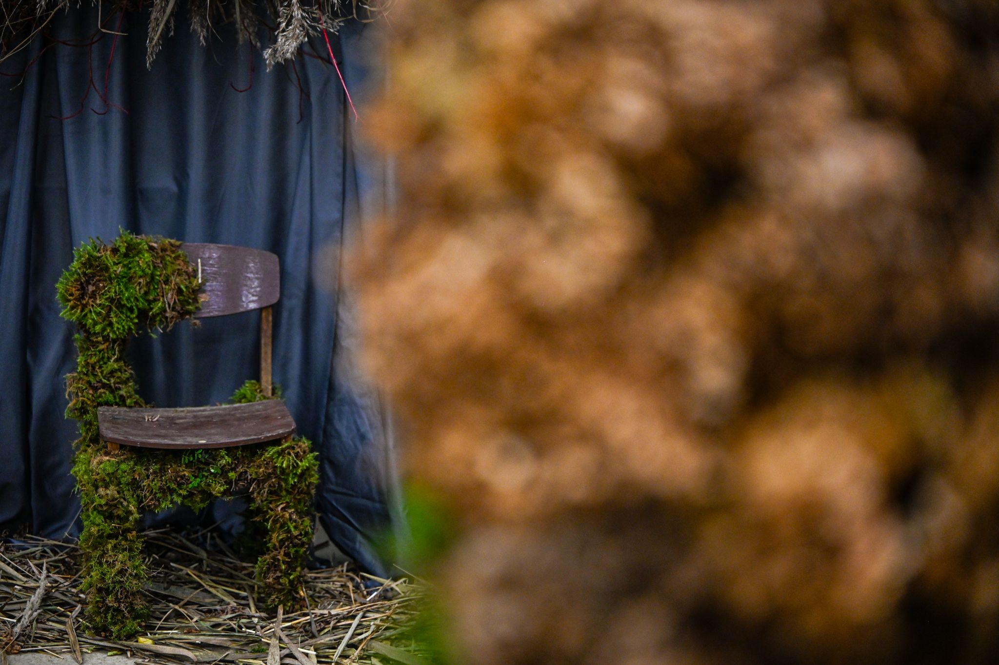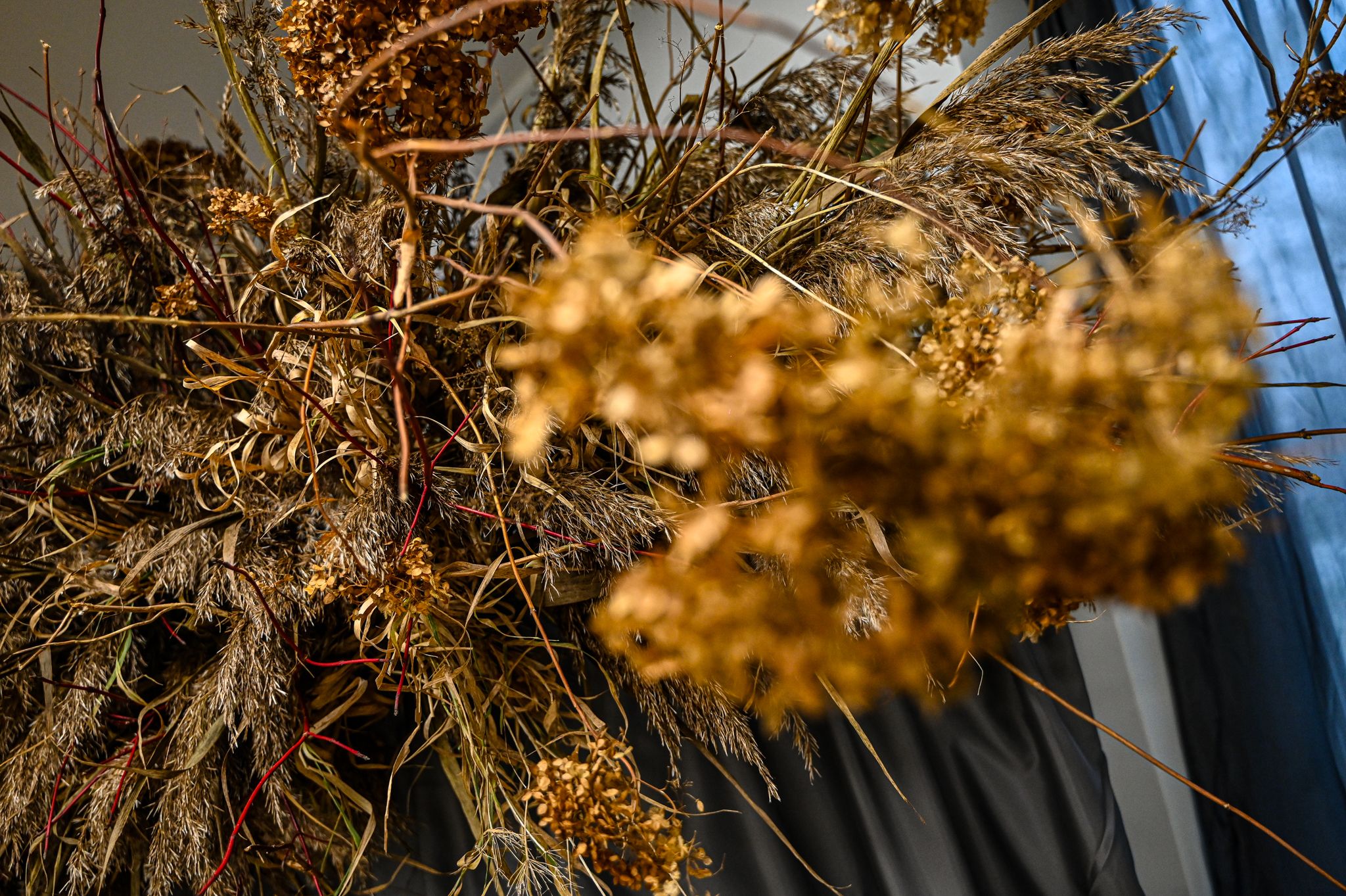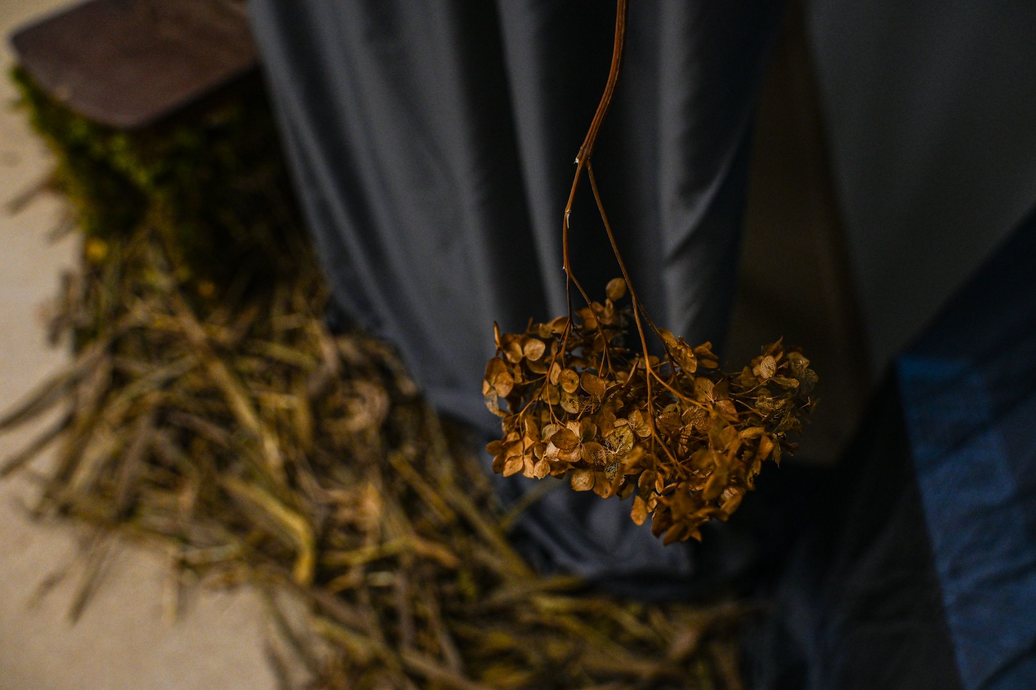 Ji sakė, kad instaliaciją sugalvojo visiškai spontaniškai ir per porą dienų vienoje iš bendruomenės salių ją sudėliojo kartu su Romu ir Daiva Kundeliais. Nors dirba su įvairiausiais pasaulio augalais, šimtais įvairiausių gėlių rūšių, šioje instaliacijoje jai mieliausia tai, kad absoliučiai viskas iš Obelių. Samanos, beržo tošis, obuoliai, lapai, smilgos, nurodavusios gėlės, kurias jau ketinta nupjauti, o kompozicijai puikiausiai tiko.