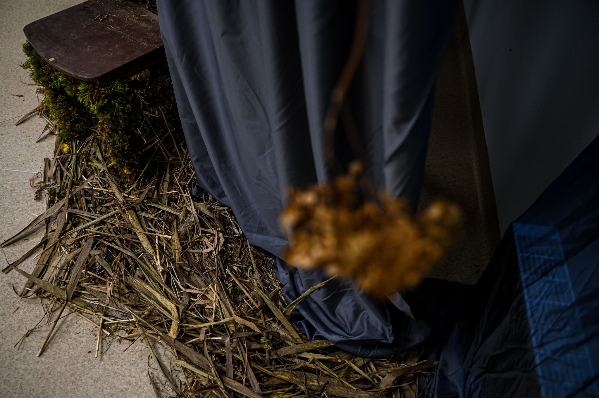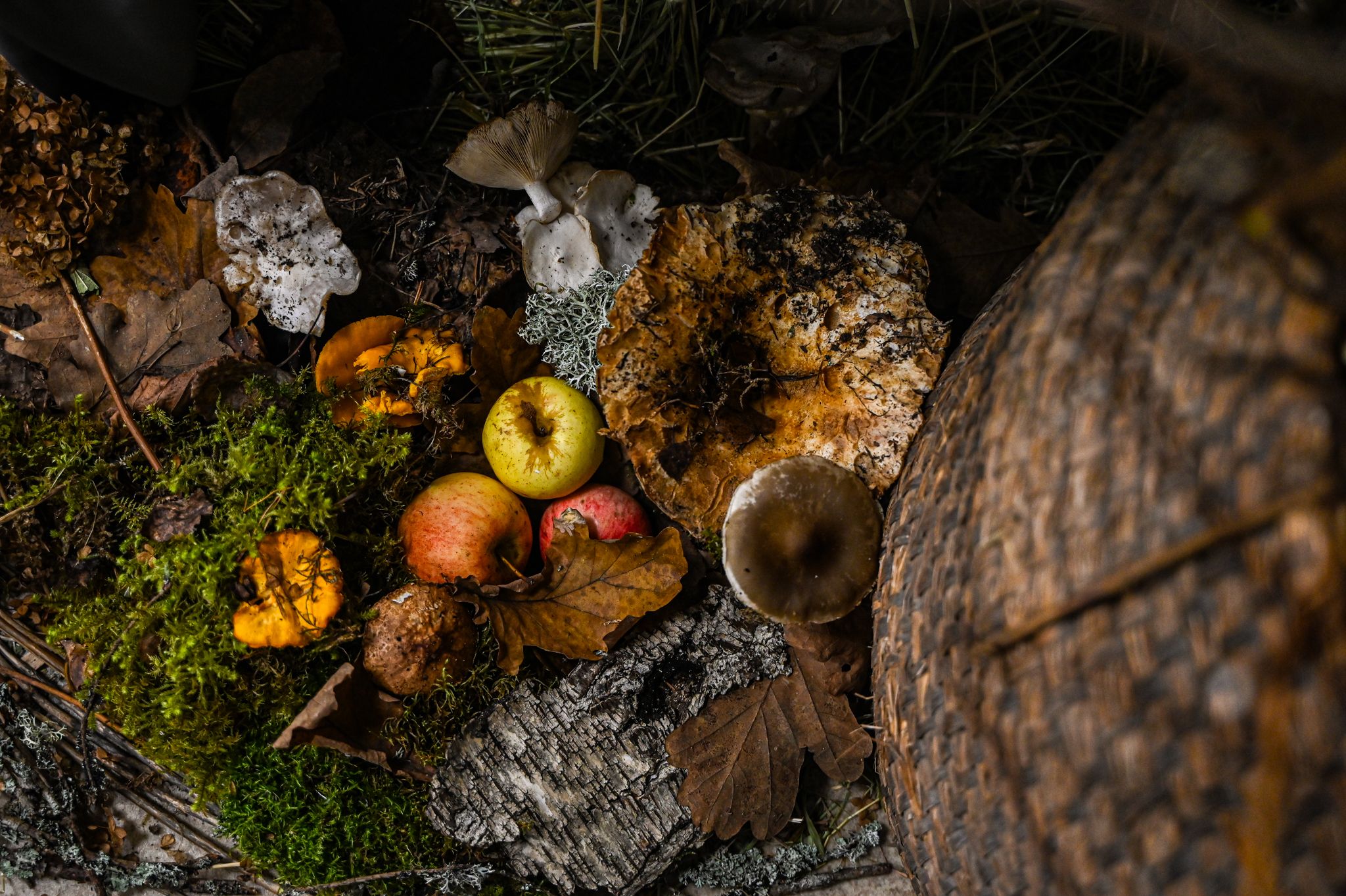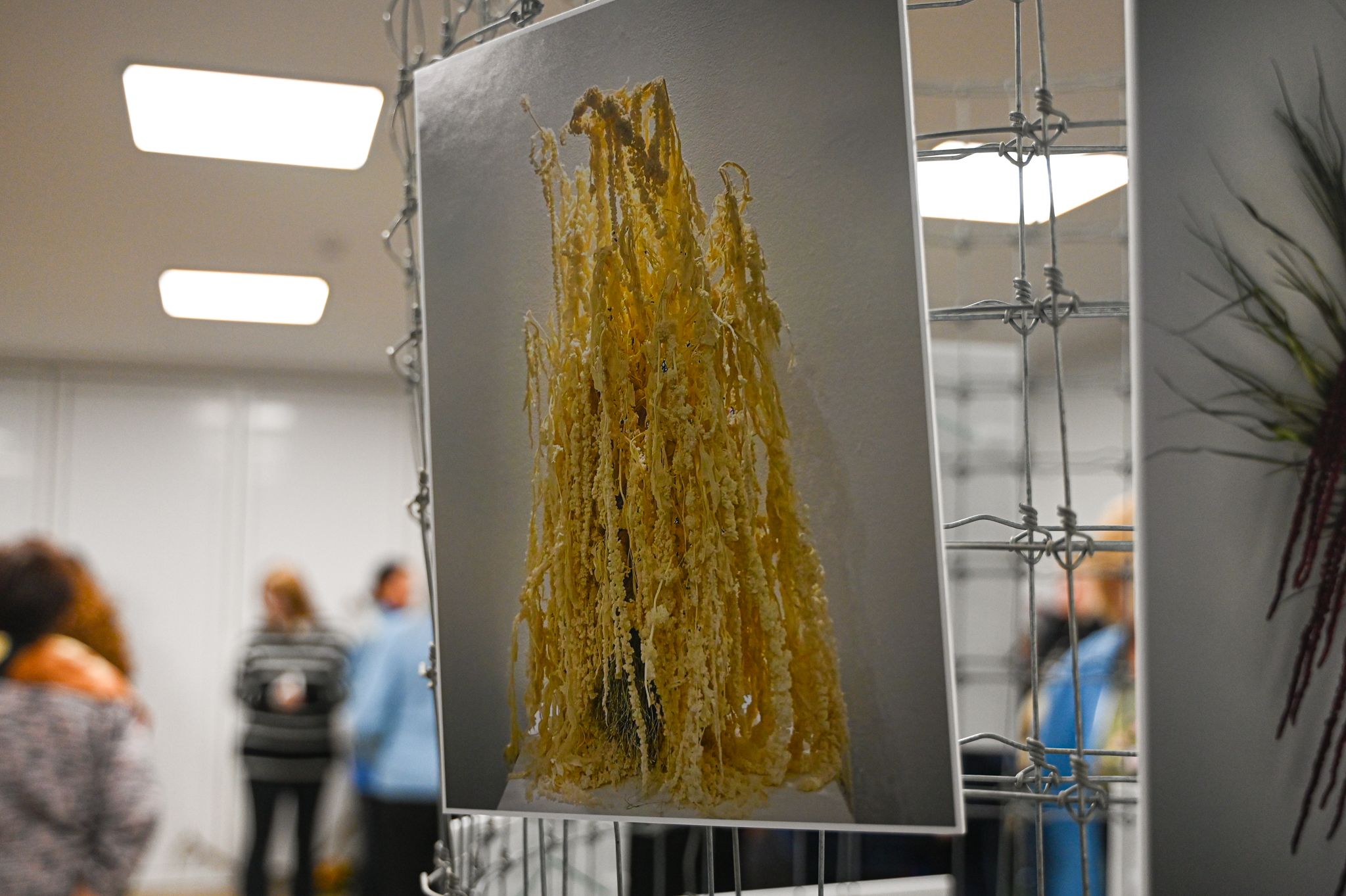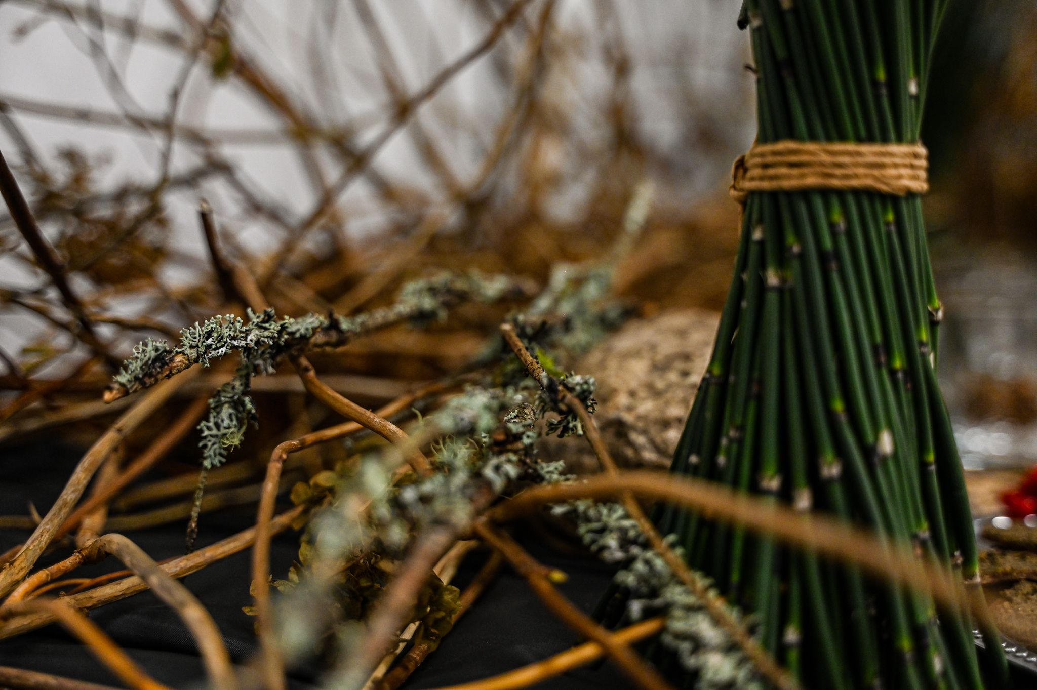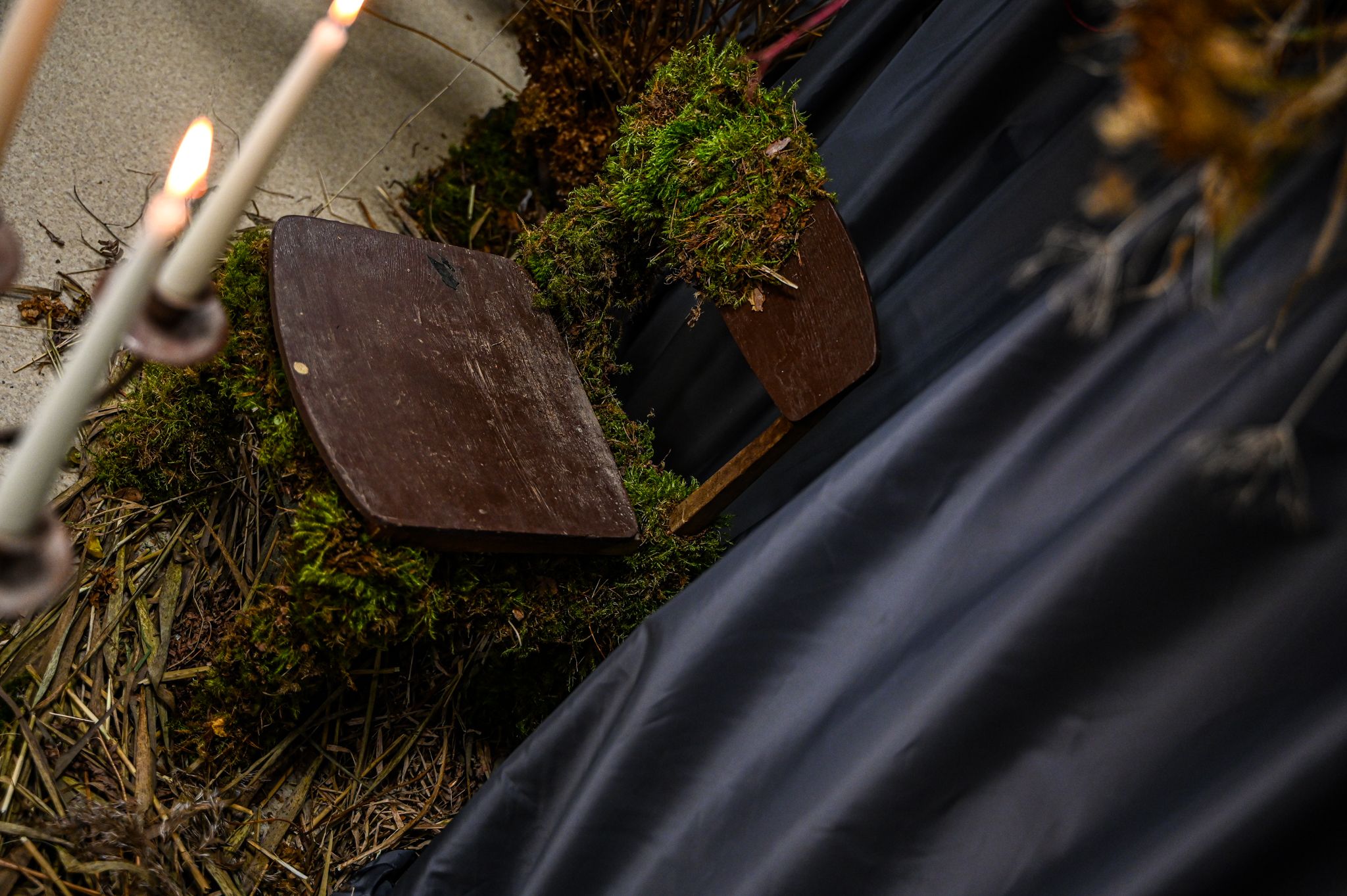 Ji sakė, kad instaliaciją sugalvojo visiškai spontaniškai ir per porą dienų vienoje iš bendruomenės salių ją sudėliojo kartu su Romu ir Daiva Kundeliais. Nors dirba su įvairiausiais pasaulio augalais, šimtais įvairiausių gėlių rūšių, šioje instaliacijoje jai mieliausia tai, kad absoliučiai viskas iš Obelių. Samanos, beržo tošis, obuoliai, lapai, smilgos, nurodavusios gėlės, kurias jau ketinta nupjauti, o kompozicijai puikiausiai tiko.