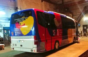 Rokiškio miesto logotipu ir šūkiu papuoštas tarpmiestinis autobusas
