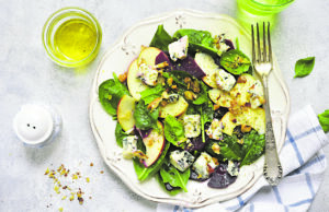Reikės: 2 obuolių, 80 g mėgstamų salotų, 2 šaukštų razinų, 1 šaukšto citrinos sulčių, 80 g ožkos sūrio, 30 g...