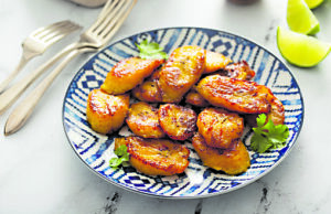 Lengva ir pikantiška vakarienė – grilinta vištiena su karamelizuotais bananais