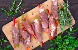 Spalvingi kiaulienos suktinukai su daržovėmis