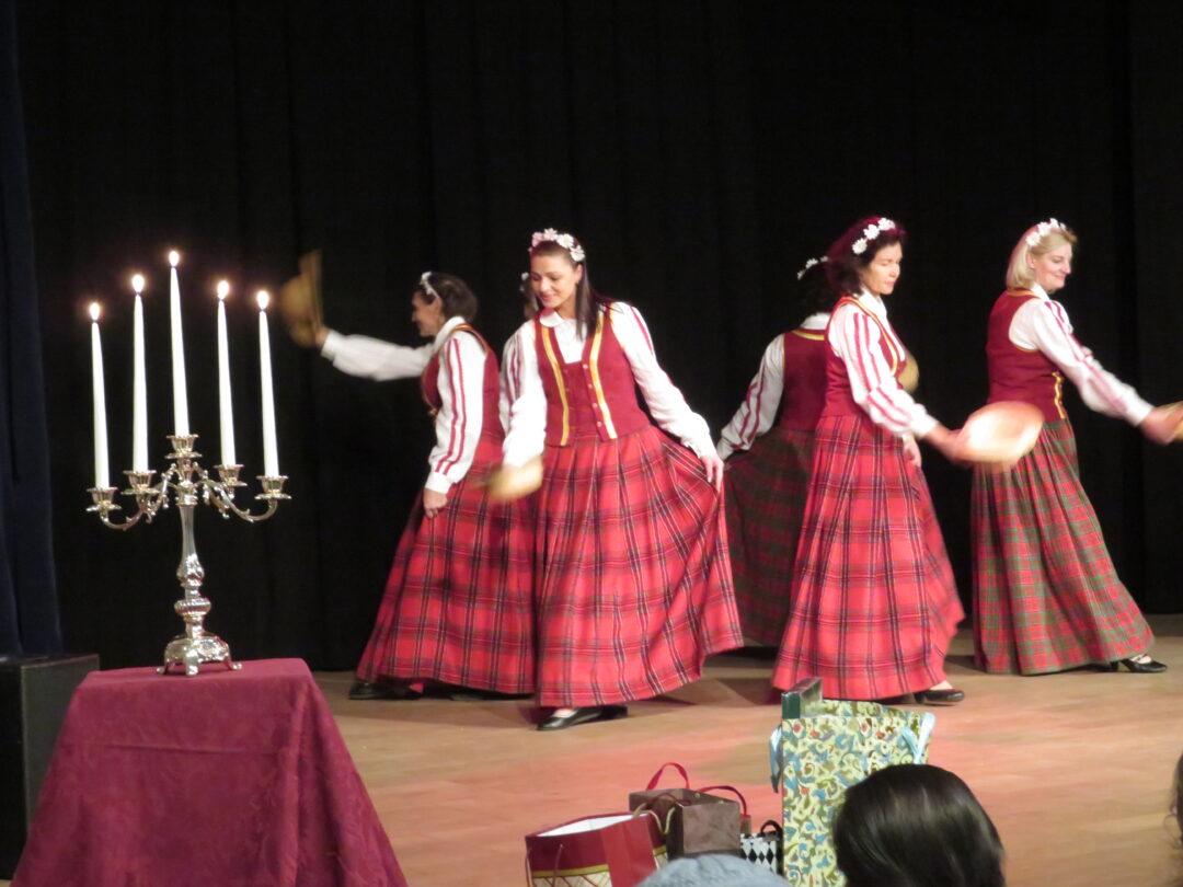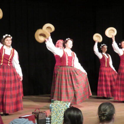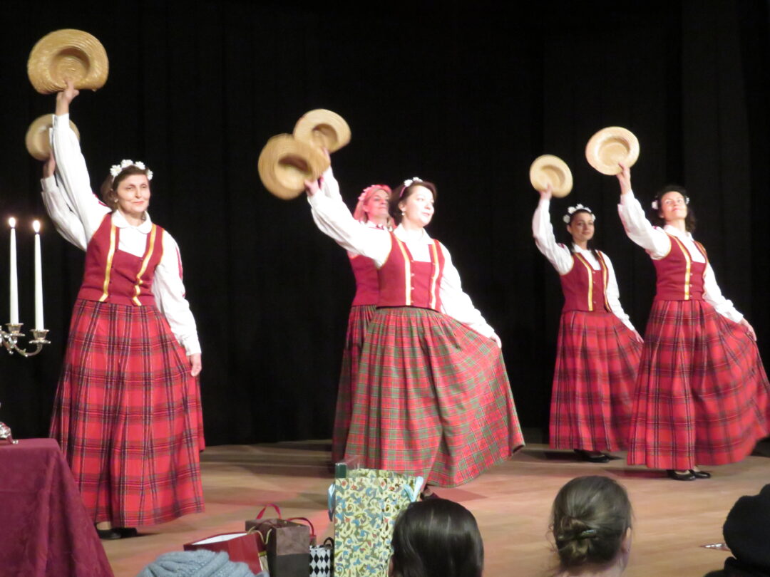Pabendrauti tarpusavyje giedotojai rinkosi į kultūros centrą, kur juos šokiu „Kepurinė“ pasveikino pandėlietės šokėjos.