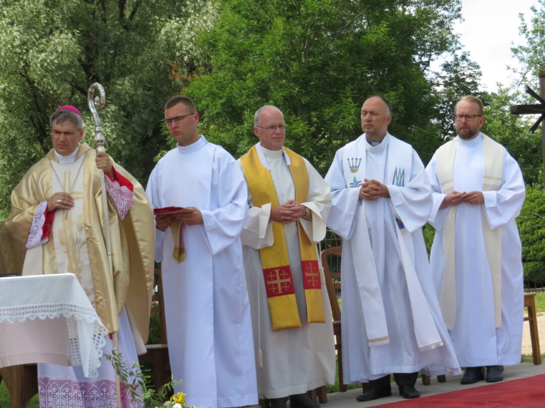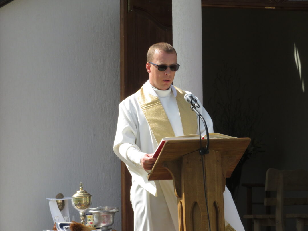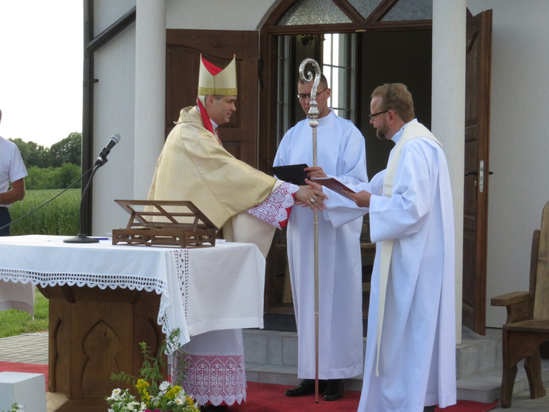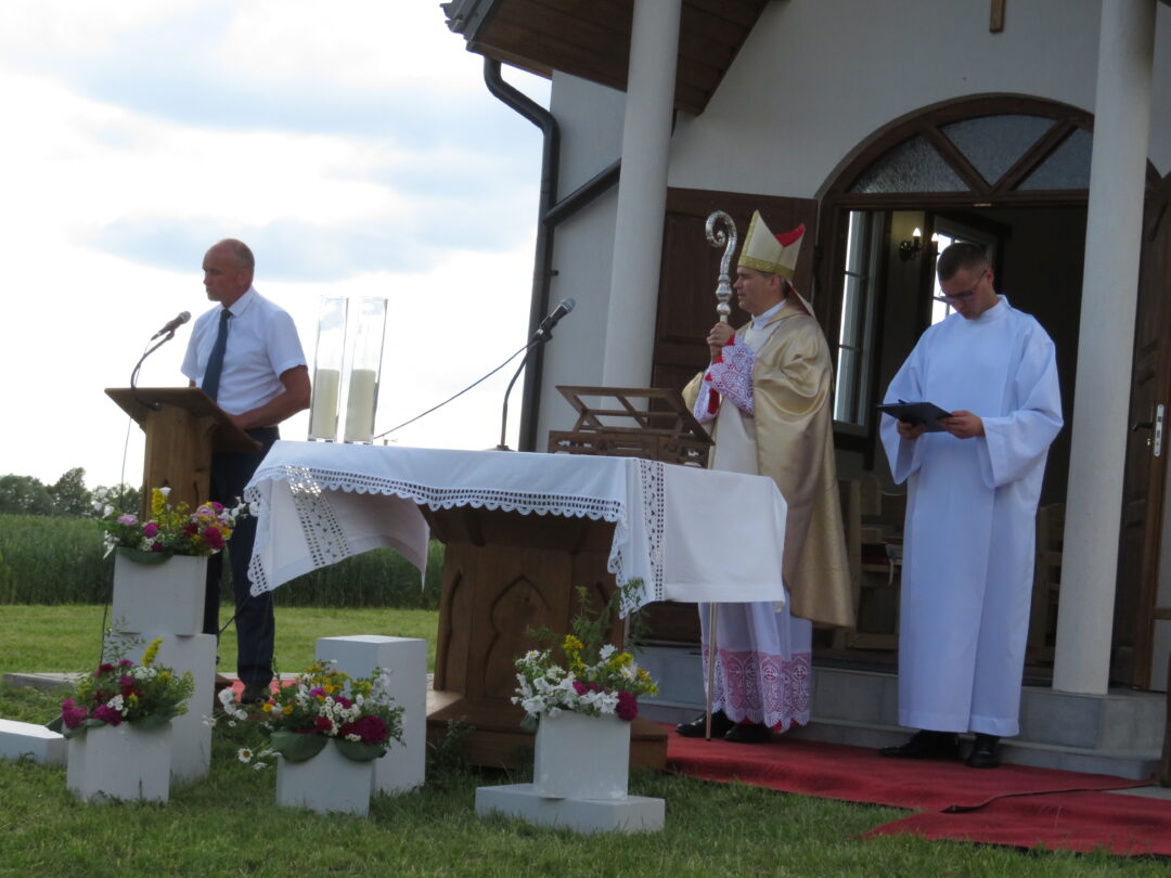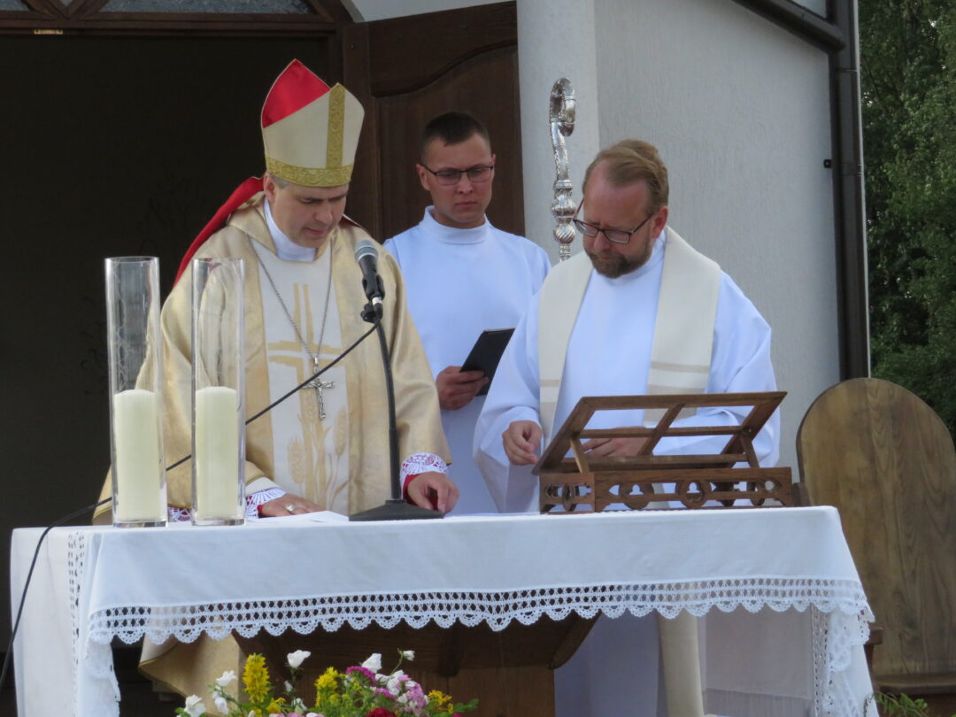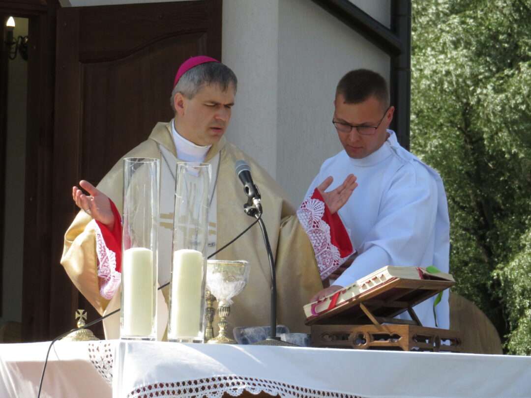 Iškilmės prasidėjo šv. Mišiomis koplyčios priešakyje. Jas aukojo Panevėžio vyskupas Linas Vodopjanovas OFM, talkino generalvikaras Eugenijus Styra, Kamajų parapijos klebonas Andrius Šukys, Rokiškio Šv. apaštalo evangelisto Mato bažnyčios vikaras Dainius Matiukas, Pandėlio parapijos klebonas Albertas Kasperavičius, giedojo Kamajų bažnyčios vokalinis ansamblis. Vyskupas linkėjo parapijai ir bendruomenei garsėti pamaldumu, geru žodžiu ir darbais, dėkojo už ryžtą ir atliktą darbą.
