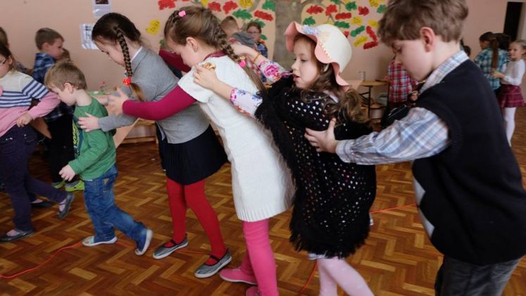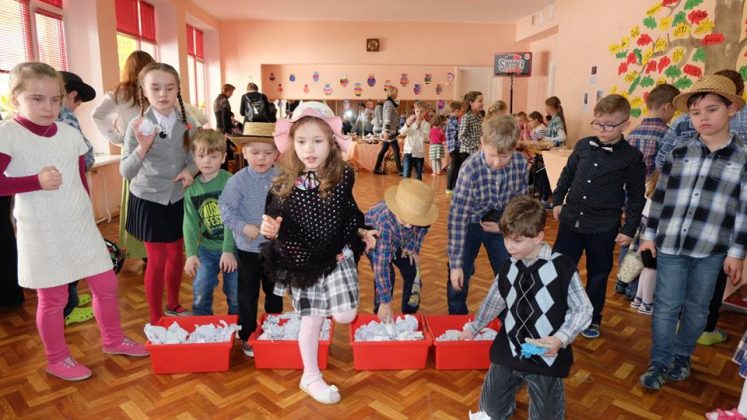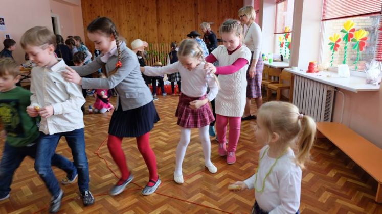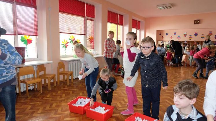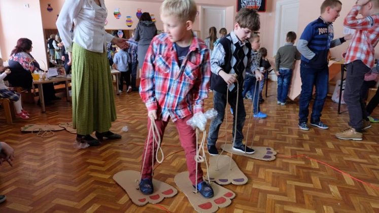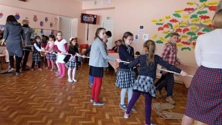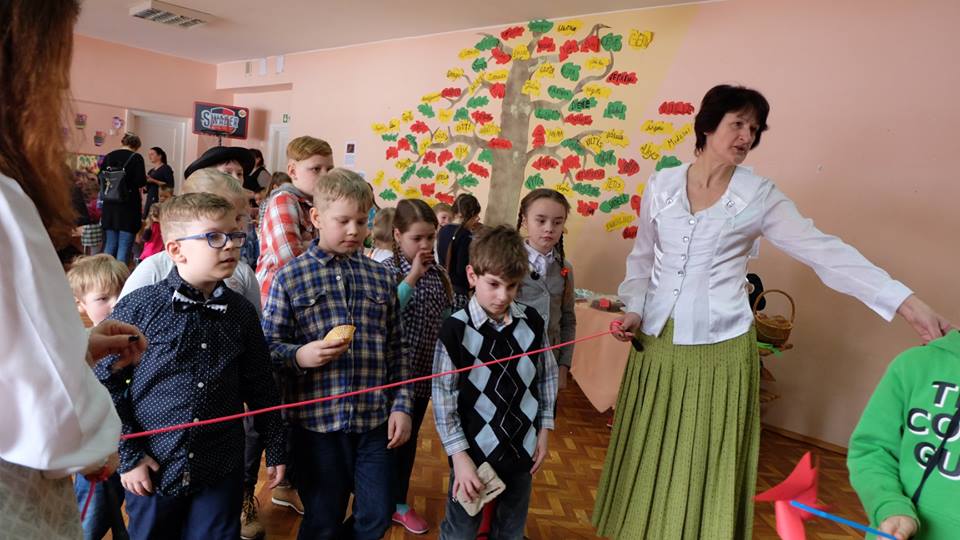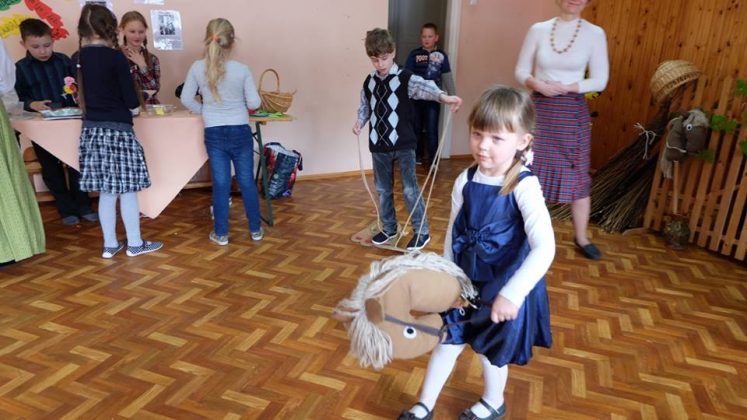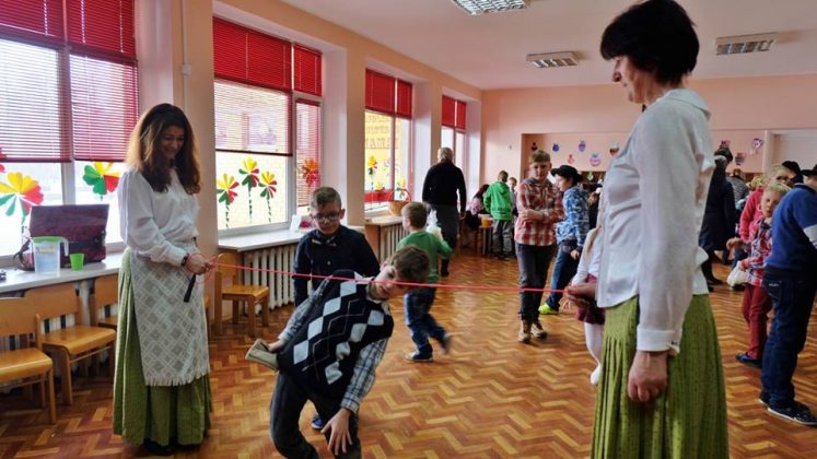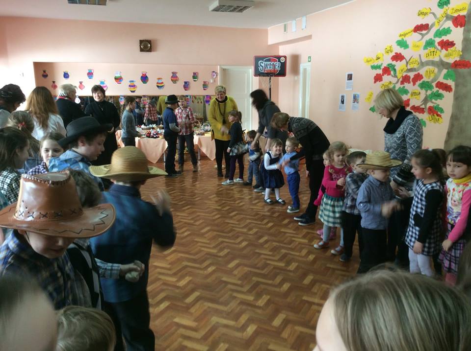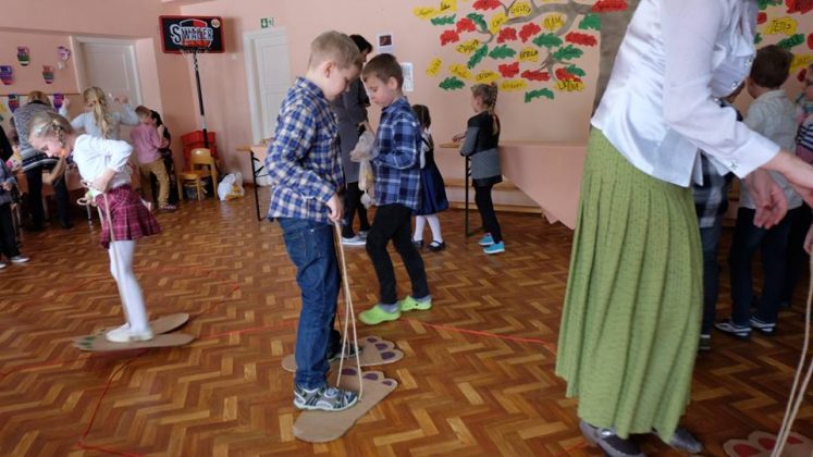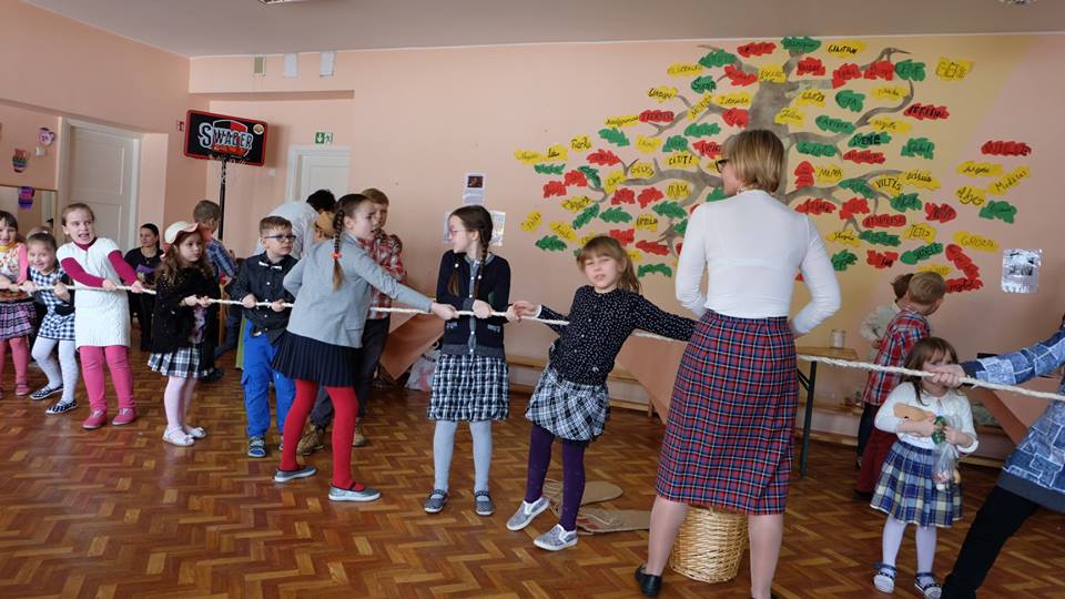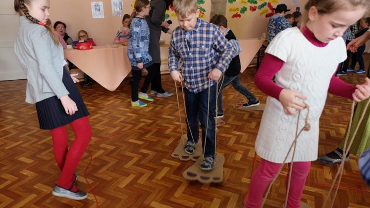 Po prekybos vaikus mokytojai pakviečia pažaisti: išbandyti taiklumą, lankstumą, vikrumą. Vaikams buvo smagu traukti virvę ir išbandyti „milžino pėdas“, mėtyti popieriaus gniūžtes, eiti susikabinus suraizgyta virve.