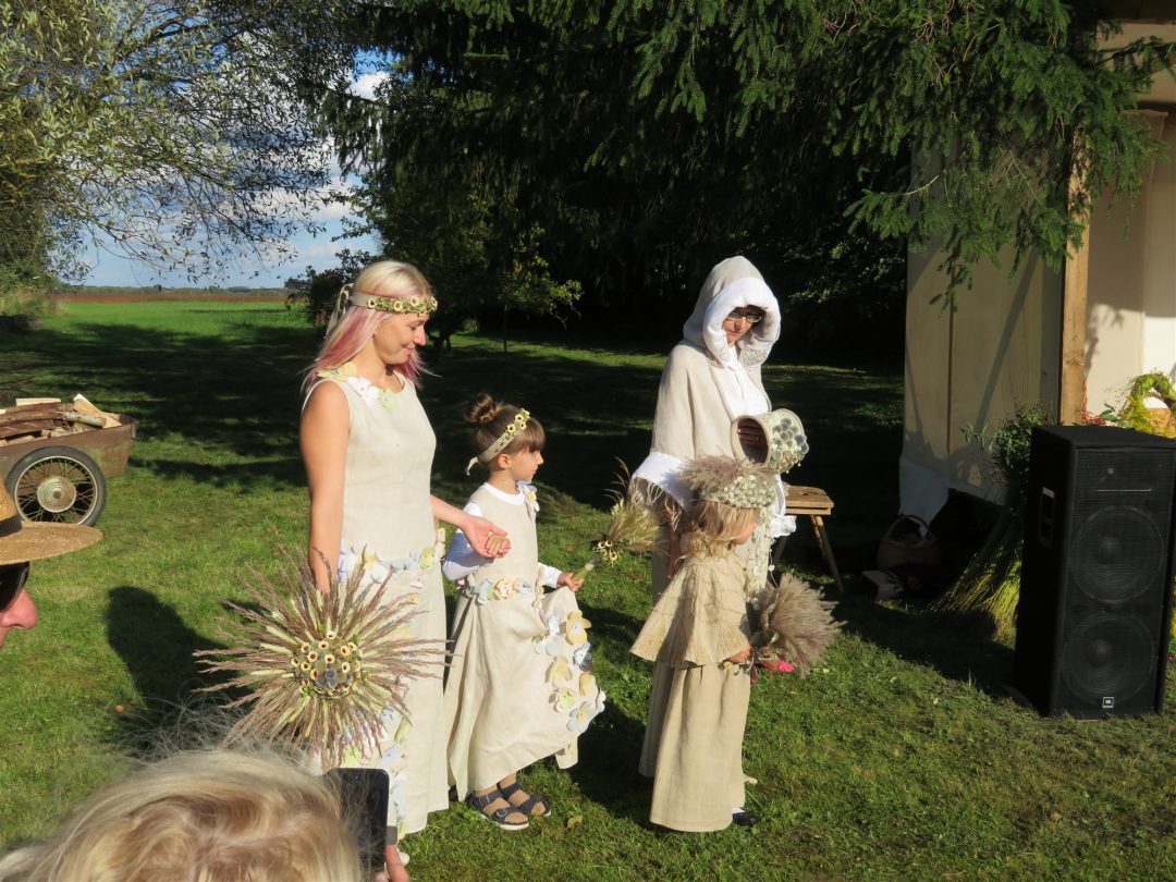 Šalia buvo įsikūrusios tautiniais drabužiais apsirengusios vilnos ir linų verpėjos – Renata Čeponienė su dukrele Rugile. Moteris dirba kultūrinių renginių organizatore Dubingiuose (Molėtų r.), yra kilusi iš Šetekšnų kaimo. „Lino mūkoje“ verpti paragino mama Danutė Mažeikienė. „Iš ryto dalyvavome derliaus šventėje Molėtuose, po pietų atvykome čia. Pati verpiu tik antrus metus, todėl dar nevedu edukacinių programų. Mane visuomet domino senieji amatai. Matant, kad jie eina užmarštin, pačiai parūpo išmokti ir perduoti patirtį vaikams“, – pasakojo molėtiškė, kartu atsivežusi ir dvi dukreles. Tiesa, mažoji dar nesiėmė darbų ir kantriai sėdėjo stebėdama, kaip verpia mama ir vyresnė sesuo. Paklausta, kada paskutinį kartą Lietuvoje matė žydinčius linus, sakė, kad šią vasarą šalia Dubingių: „ Bet jie buvo neaukšti, tad su vyru nusprendėme, jog nepluoštiniai, auginami tik dėl sėmenų.“ Ji įpratusi verpti vilną, tačiau šįkart pabando verpti šventės organizatorių parūpintus linus. Ar buvo besidominčiųjų? „Taip, domisi ir vaikai, ir suaugusieji“, – sakė moteris. Drąsiai apie tai, kaip išmoko šio amato, pasakojo dukra Rugilė: „Mačiau, kaip dirba mama, labai norėjau ir vilną verpti išmokau per tris mėnesius. Mama jau numezgė keletą porų kojinių iš tų siūlų. Esu bandžiusi ir sukti siūlus.“ D. Mažeikienė sakė verpti beveik nemokanti ir didžiuojasi dukra, kuri labai norėjo išmokti verpti, nusipirko avių, įsigijo ratelius. Tačiau D. Mažeikienė turi kitą talentą – puikiai kuria eiles. Šventėje ji skaitė savo kūrybos eilėraščius.