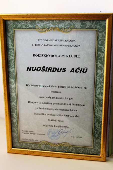 Rajono Neįgaliųjų draugijos, vienijančios per 300 narių, pirmininkas Algis Veikšys nuoširdžiai dėkojo Rotary klubo nariams už dosnumą ir įteikė padėkos raštą sakydamas, kad būti šviesos spinduliu kitiems ir skleisti šviesą – didžiausia laimė, kurią gali pasiekti žmogus.