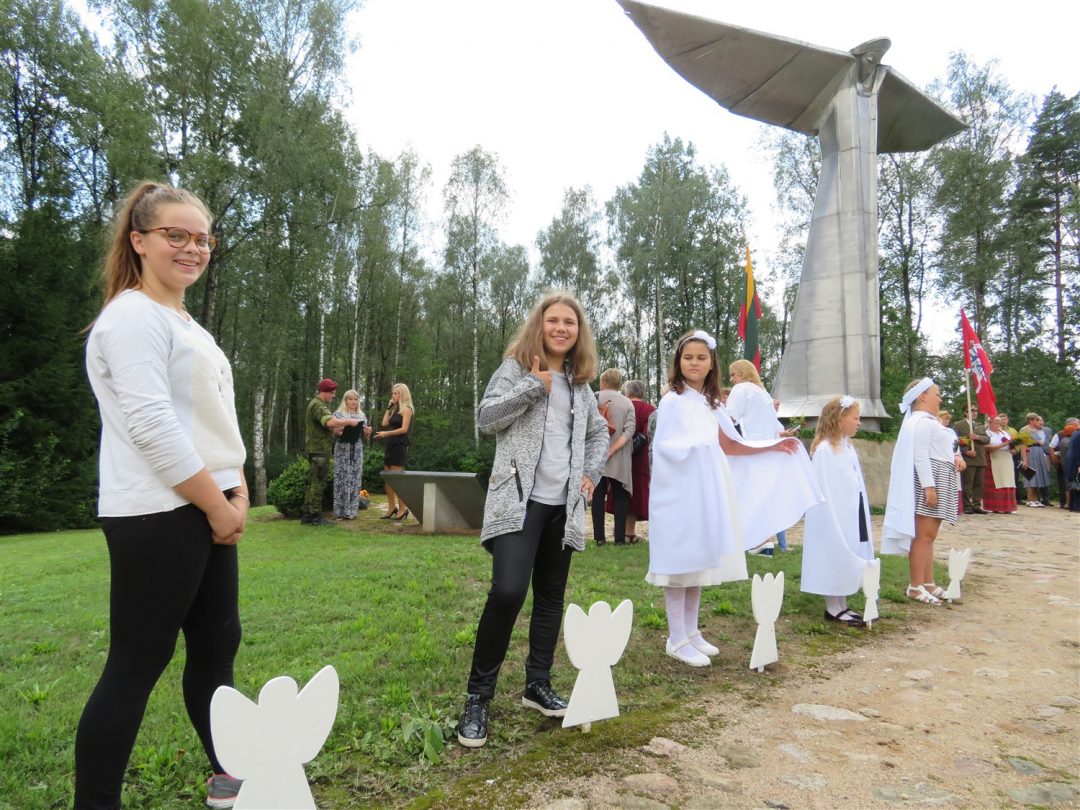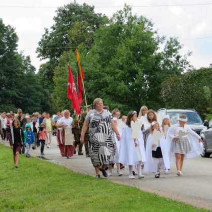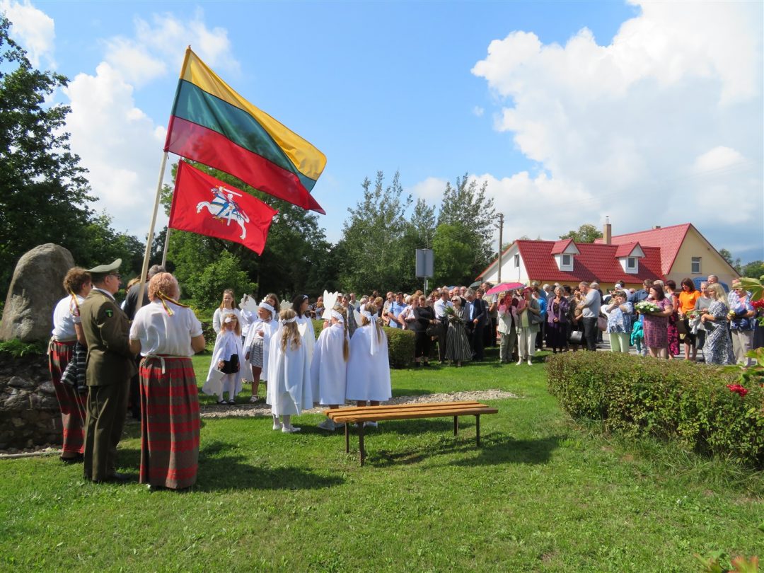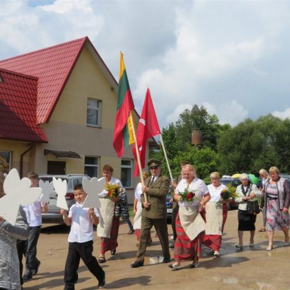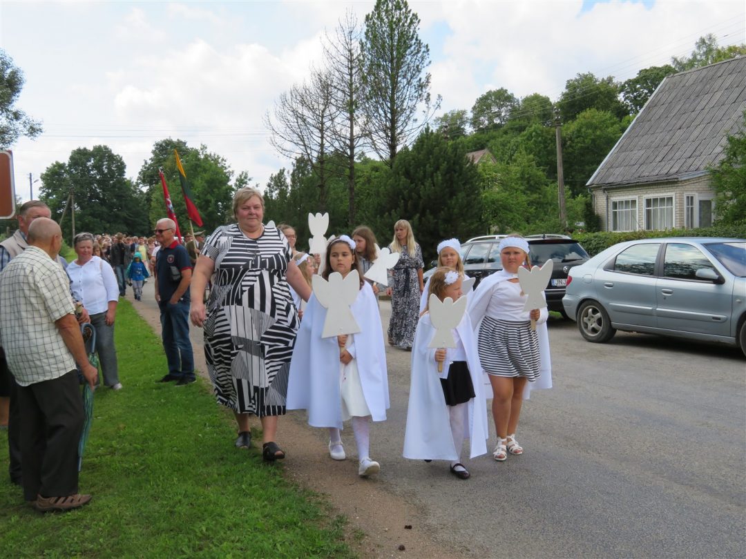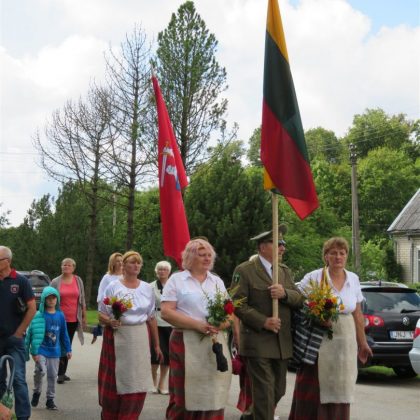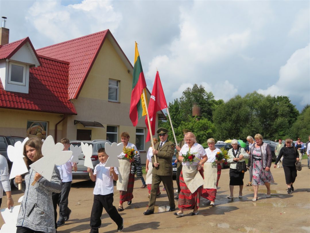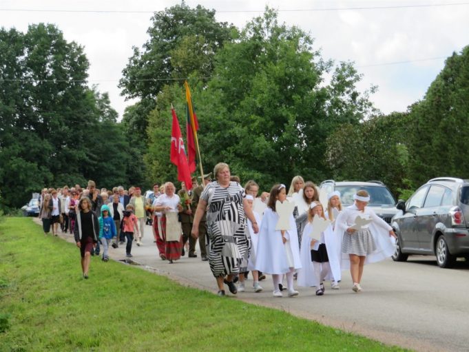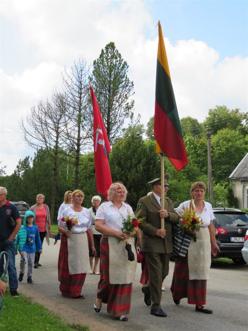 Iš pilnutėlės bažnyčios iškilminga eisena pasuko prie paminklinio akmens miestelio centre. Eisenos priekyje žengė baltai apsirengę, stilizuotus angeliukus nešantys vaikai, tautiniais drabužiais pasidabinusios moterys, vėliavas nešė šauliai.