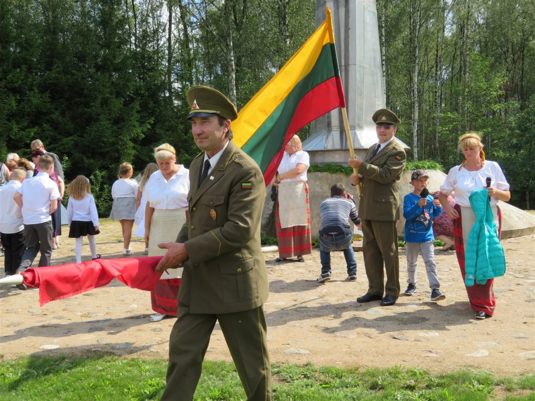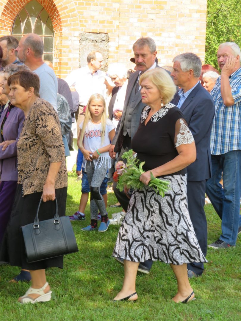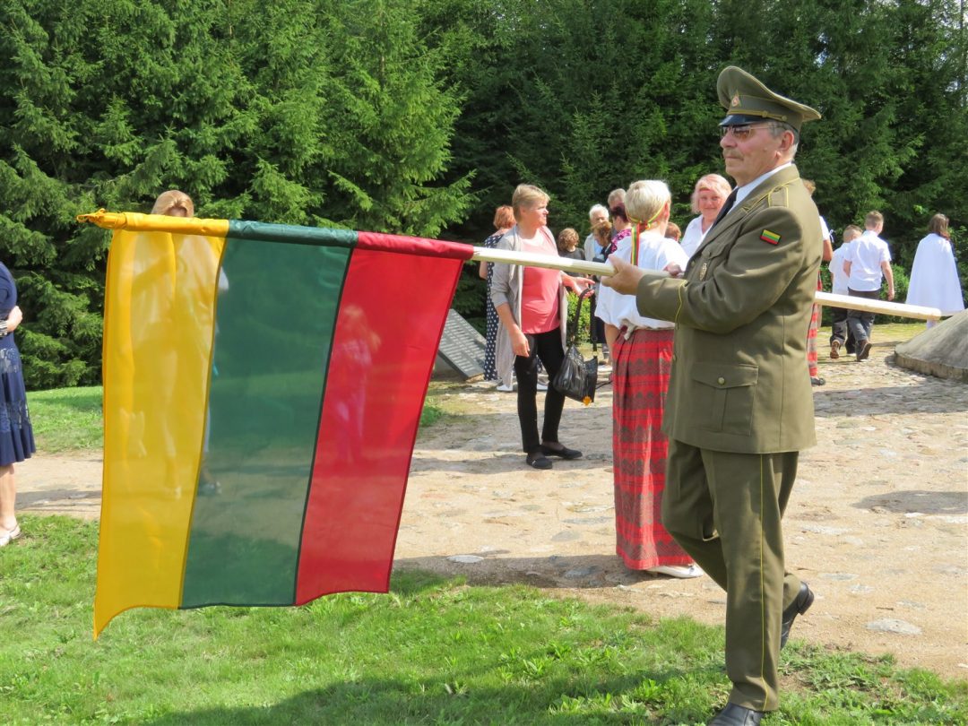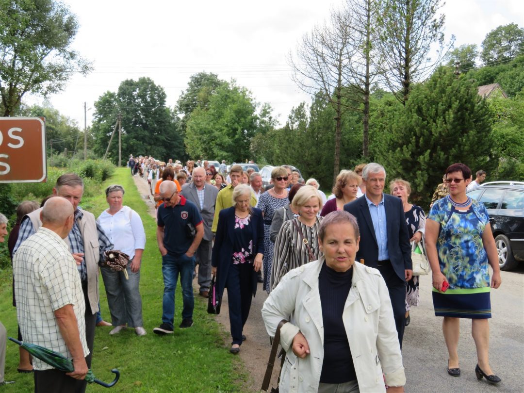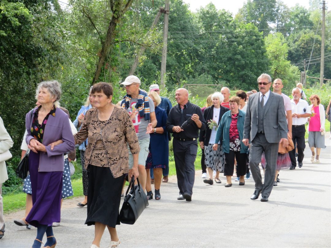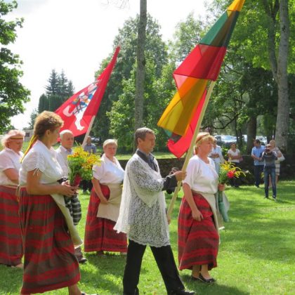 Iš pilnutėlės bažnyčios iškilminga eisena pasuko prie paminklinio akmens miestelio centre. Eisenos priekyje žengė baltai apsirengę, stilizuotus angeliukus nešantys vaikai, tautiniais drabužiais pasidabinusios moterys, vėliavas nešė šauliai.