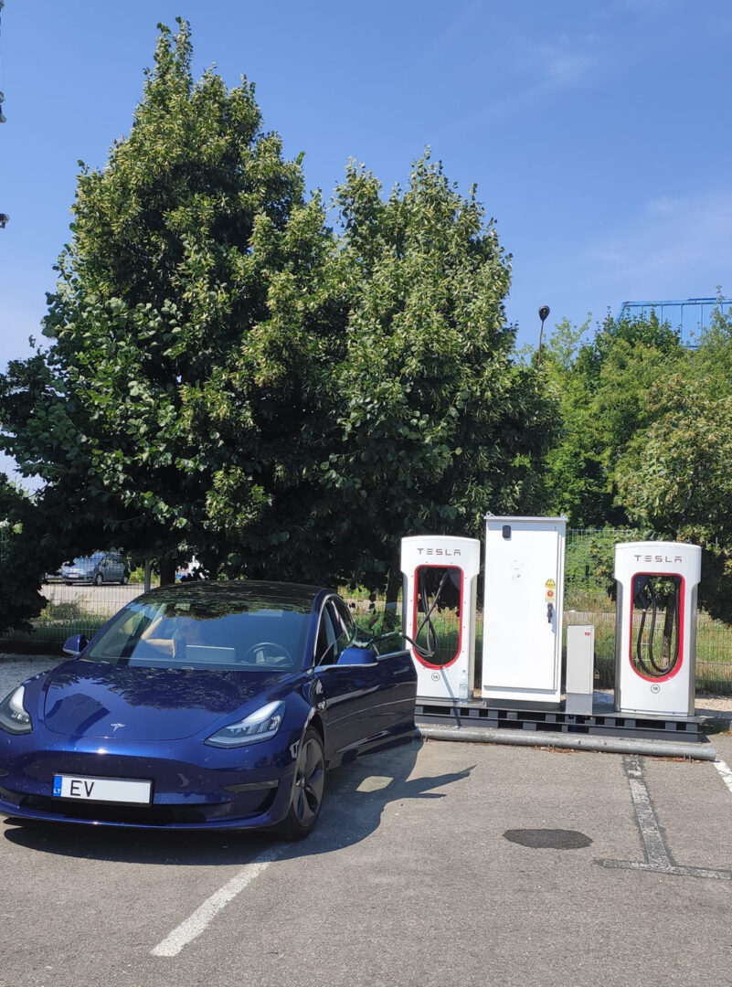 Praėjusią vasarą Artūras Dilys su elektromobiliu išsiruošė į 2100 km kelionę. Nuotr. prie vienos iš „Teslos“ greitojo įkrovimo stotelių.