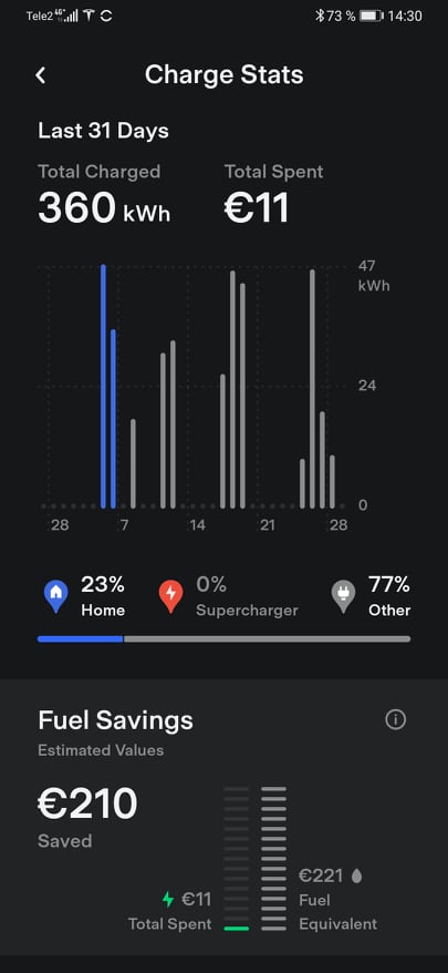 Elektromobiliu jis nuvažiuoja apie 2000 km per mėn., o telefono programėlė apskaičiuoja, kiek kainavo įkrovimai, kiek būtum sunaudojęs pinigų įprastam kurui. „Programėlės skaičiavimais remiantis, per mėnesį sutaupau apie 300 eurų, kuriuos bučiau išleidęs kurui. Vasarą keliavome maršrutu Rokiškis–Varšuva–Krokuva–Zakopanė–Rokiškis. Įveikėme apie 2100 km. Stodami įkrauti mašiną mokamose greitosiose stotelėse visai kelionei išleidome vos 40 eurų“, – pasakoja A. Dilys.