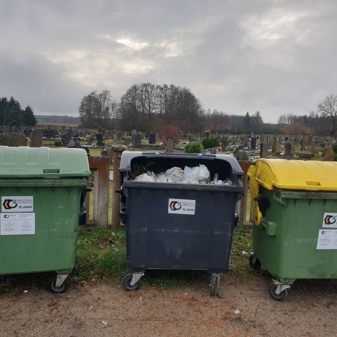 - Mišrių atliekų konteineriai. Jie skirti vainikų ir krepšelių liekanoms, gėlių kempinėms ir kitoms atliekoms, kurių negalima išrūšiuoti į aukščiau minėtus konteinerius.