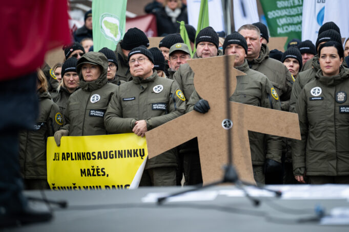 Lietuvos aplinkos apsaugos sistemos darbuotojų profesinės sąjungos pirmininkas Vaidas Laukys kolegoms proteste tvirtino pasigendantis valdžios pastangų stirpinti aplinkosaugą.