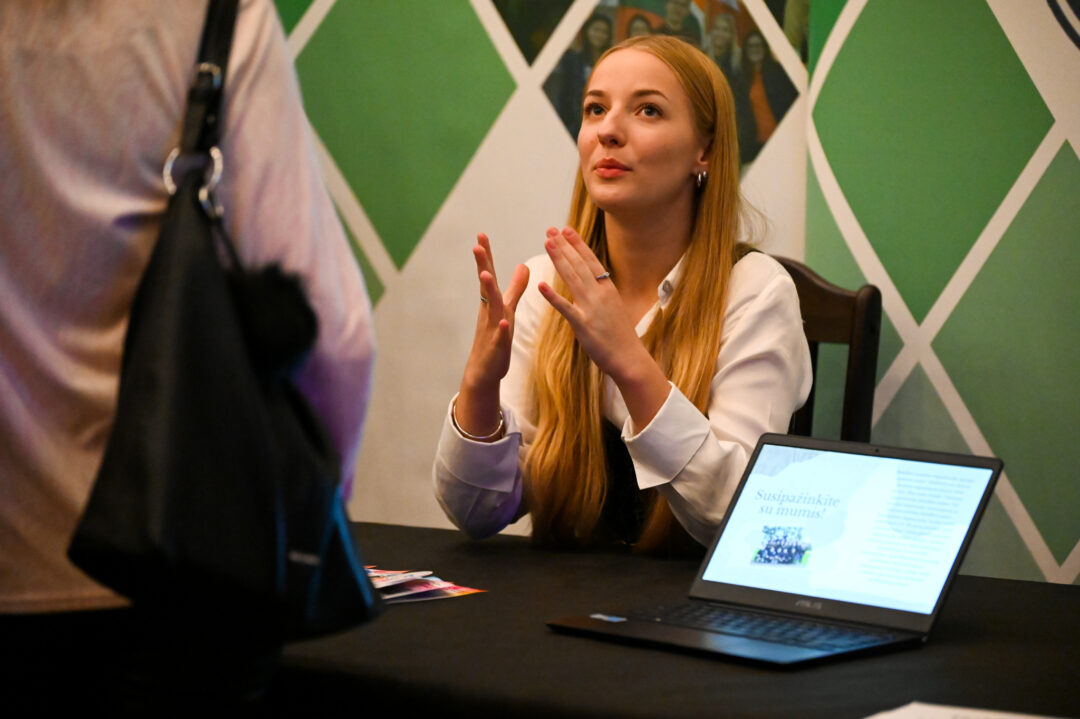 Samanta: – Renginio metu vyko mugė, kurioje dalyvavo 10 atstovų iš skirtingų įstaigų bei organizacijų. Sulaukėme atstovų iš Vilniaus, kurie atstovavo Lietuvos jaunimo organizacijų tarybai (LiJOT). Kitos įstaigos/organizacijos iš Rokiškio rajono, kurios priima savanorius, tai Jaunimo organizacijų sąjunga „Apvalus stalas“, Obelių socialinių paslaugų namų globos centras, Rokiškio jaunimo centras, Lietuvos raudonojo kryžiaus draugija, rajono Vietos veiklos grupė, Skemų socialinės globos namai, Socialinės paramos centras, Pirminės asmens sveikatos priežiūros centras bei Rokiškio baseinas. Šios mugės tikslas – parodyti jaunimui, kiek daug pasirinkimų savanoriauti yra Rokiškio rajone. Jaunuoliai turėjo galimybę pasikalbėti su atstovais, kokias veiklas atlieka savanoris įstaigoje ar organizacijoje.