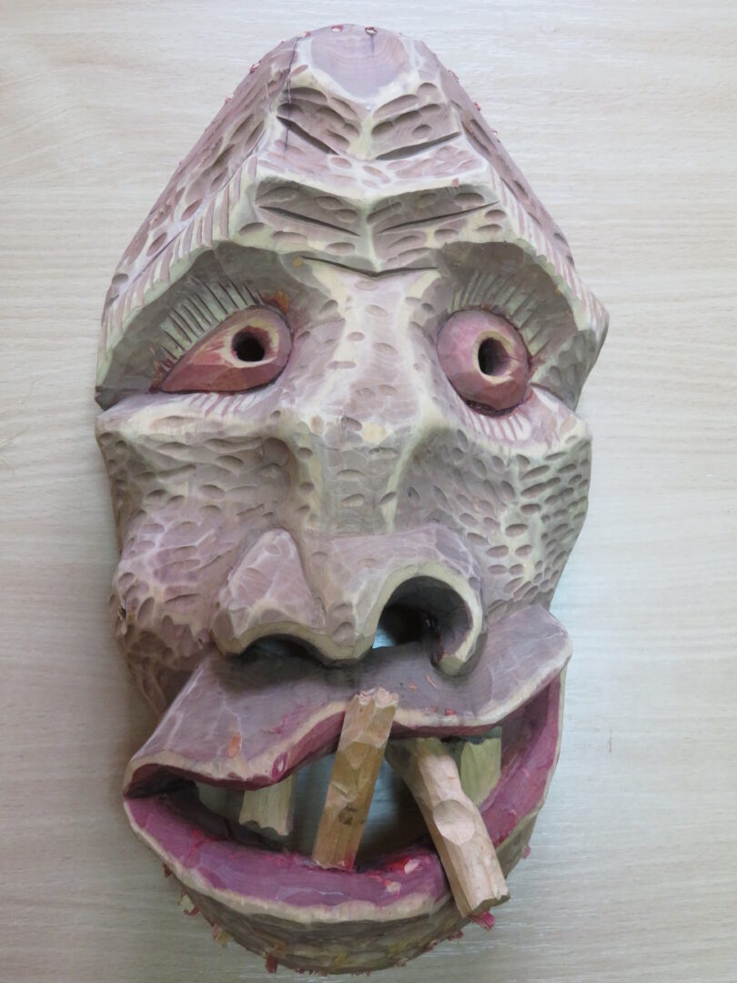 Beje, kaukės dažnai atrodo atgrasios – išsiviepusioje burnoje kyšo vienas kitas dantis, nosis neproporcingai didelė, kumpa, kreiva. Besišypsančios kaukės jau yra vėlyvesnė liaudies meistrų, tautodailininkų kūryba.