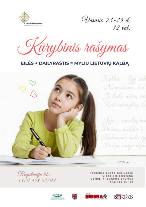 Vasario 23-25 d. 12 val. – Kūrybinis rašymas „Eilės+dailyraštis=myliu lietuvių kalbą“, skirtas Gimtosios kalbos dienai.