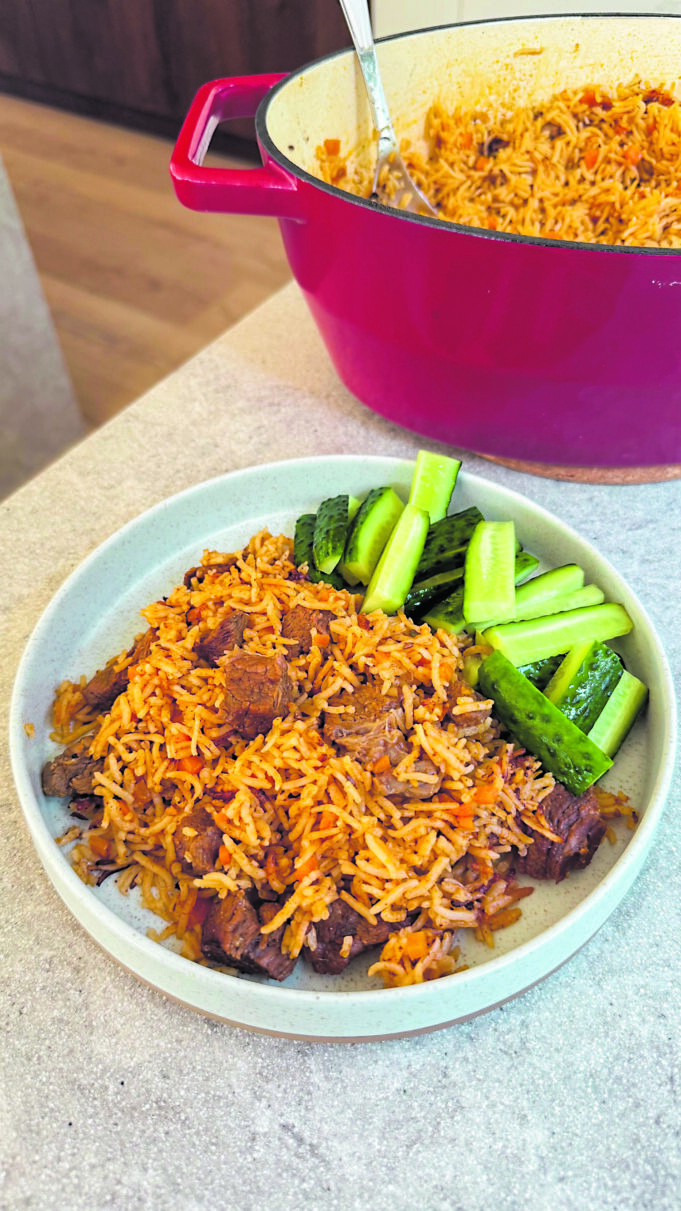 Reikės: 500 g jautienos sprandinės, 2 morkų, aliejaus kepimui, druskos, pipirų, 1 a. š. česnako miltelių, 1 a. š. maltos paprikos, 1/2 a. š. malto kumino, 700 ml sultinio, 3 v. š. pomidorų padažo, 350 g basmati ryžių, 1 česnako galvos, šviežių petražolių, silpnai sūdytų arba raugintų agurkų.