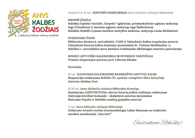 Vasario 6 d. 14 val. – ANYS KALBES ŽODŽIAIS. Rokiškis – Lietuvių kalbos dienų sostinė 2026 paskelbimas, Rokiškio rajono savivaldybės Juozo Keliuočio viešojoje bibliotekoje.