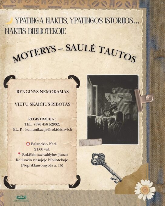 Balandžio 29 d. 21 val. – Naktis bibliotekoje ,, Moterys – saulė tautos ‘‘ . Rokiškio rajono savivaldybės Juozo Keliuočio viešojoje bibliotekoje.