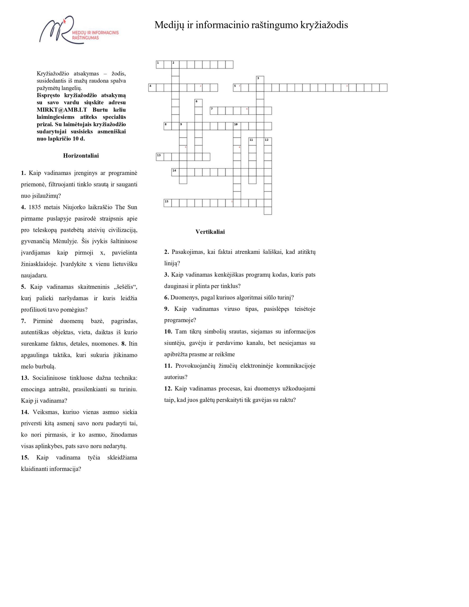 Išspręsto kryžiažodžio atsakymą su savo vardu siųskite adresu MIRKT@AMB.LT Burtu keliu laimingiesiems atiteks specialūs prizai. Su laimėtojais kryžiažodžio sudarytojai susisieks asmeniškai nuo lapkričio 10 d.
