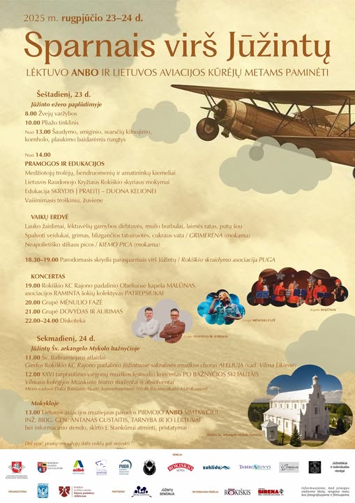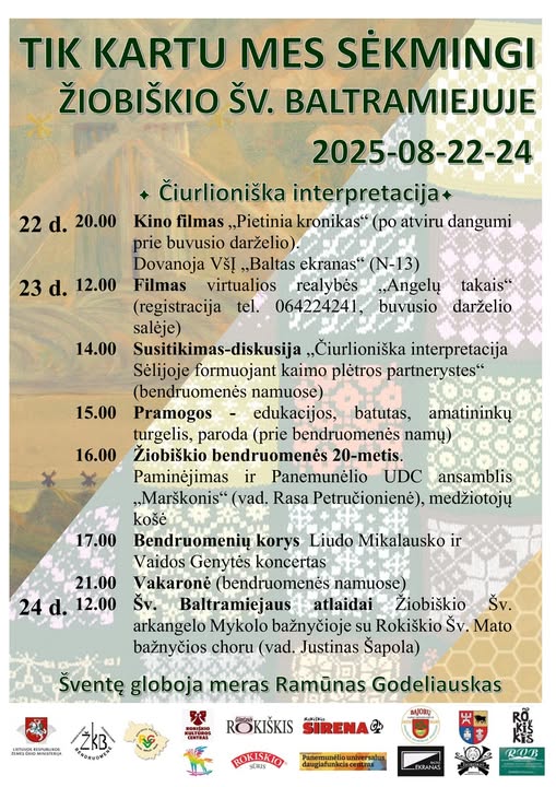 Rokiškio krašte šv. Baltramiejus – ypatinga šventė. Tad ir žmonių Jūžintuose bei Žiobiškyje tikrai netrūks. Juolab žiobiškėnai dar ir mini savo bendruomenės dvidešimtmetį, o ta proga į kaimą bent vienam savaitgaliui grįžta kinas – penktadienio vakarą visi žiūrės „Pietinia kronikas“, o šeštadienį – virtualios realybės filmą. Na, o šeštadienį bei sekmadienį viskas bus įprastai nepaprasta: pramogos, diskusijos, bendruomenių korys su Liudu Mikalausku ir Vaida Genyte, vakaronė ir širdis pakylėjantys atlaidai gražioje bažnyčioje. Jūžintai didesni už Žiobiškį, tai ir jų šventė margesnė, ir svečių daugiau sulaukia. Šįkart, be įprastinių edukacijų ir pramogų, žada nudžiuginti Rokiškio skraidymo asociacija PUGA, šeštadienio pavakare pralėksianti virš susirinkusiųjų parasparniais. Sekmadienį po atlaidų ir vargonų festivalio koncerto mokykloje bus pristatyta Aviacijos muziejaus paroda pirmojo ANBO šimtmečiui bei informacinis stendas Lietuvos aviacijos instituto įkūrėjui Jonui Stankūnui atminti. Organizatoriai perspėja, kad dėl blogo oro ne visa šventės programa gali įvykti, bet tikėkimės, kad saulės nepritrūks.
