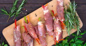 Spalvingi kiaulienos suktinukai su daržovėmis