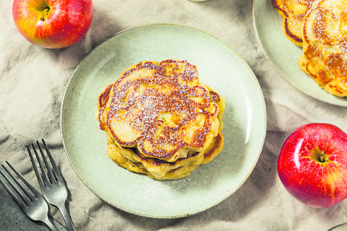 - Kepkite įkaitintoje keptuvėje su šiek tiek riebalų po kelias minutes iš abiejų pusių. Prieš patiekiant pabarstykite cinamonu, jei norite – apšlakstykite medumi ar klevų sirupu arba patiekite su uogiene.