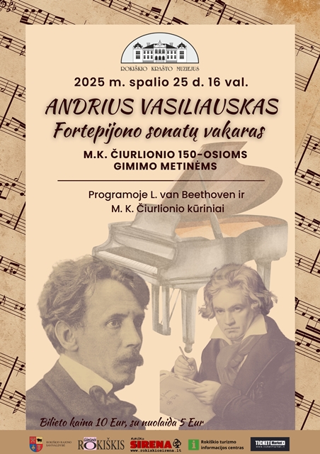 Spalio 25 d. 16 val. FORTEPIJONO SONATŲ VAKARAS (Andrius Vasiliauskas). Skirta M. K. Čiurlionio 150-osioms gimimo metinėms. Bilietai Rokiškio krašto muziejaus kasoje, Rokiškio turizmo informacijos centre ir www.ticketmarket.lr. Įsigijusiems bilietą į koncertą, dovanojame ekskursiją parodoje VYTIS IR LELIJA. Reikalinga registracija tel. +370 615 44 586 arba edukacija@muziejus.rokiskyje.lt