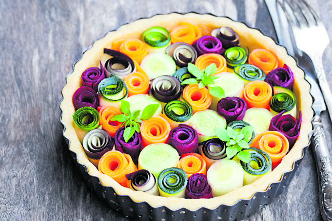 - Kiekvieną daržovių juostelę susukite į tvirtą ritinėlį ir šiek tiek įspauskite į įdarą. Pamainomis dėkite tai morkas, tai cukinijas, kol užpildysite visą pyragą.