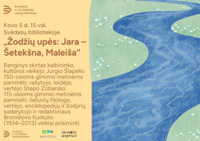 Kovo 5 d. 15 val. Svėdasų biblioteka kviečia į renginį „Žodžių upės: Jara, Šetekšna, Maleiša“, apjungsiantį tris upes, tris – Anykščių, Kupiškio ir Rokiškio – rajonus, tiek pat kaimų ir iš jų kilusias tris reikšmingas asmenybes.