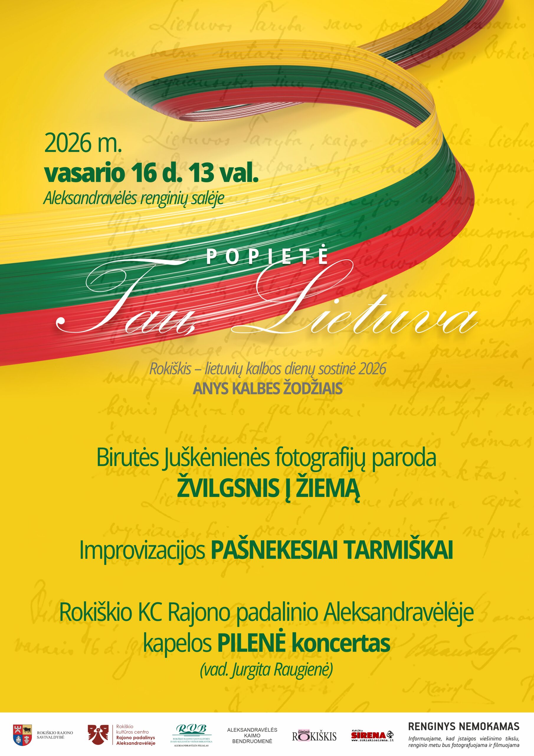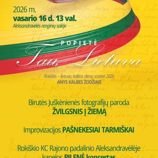 13.00 val. Popietė „Tau, Lietuva“, skirta Rokiškiui – lietuvių kalbos dienų sostinei-2026 „Anys kalbes žodžiais“ Aleksandravėlės renginių salėje