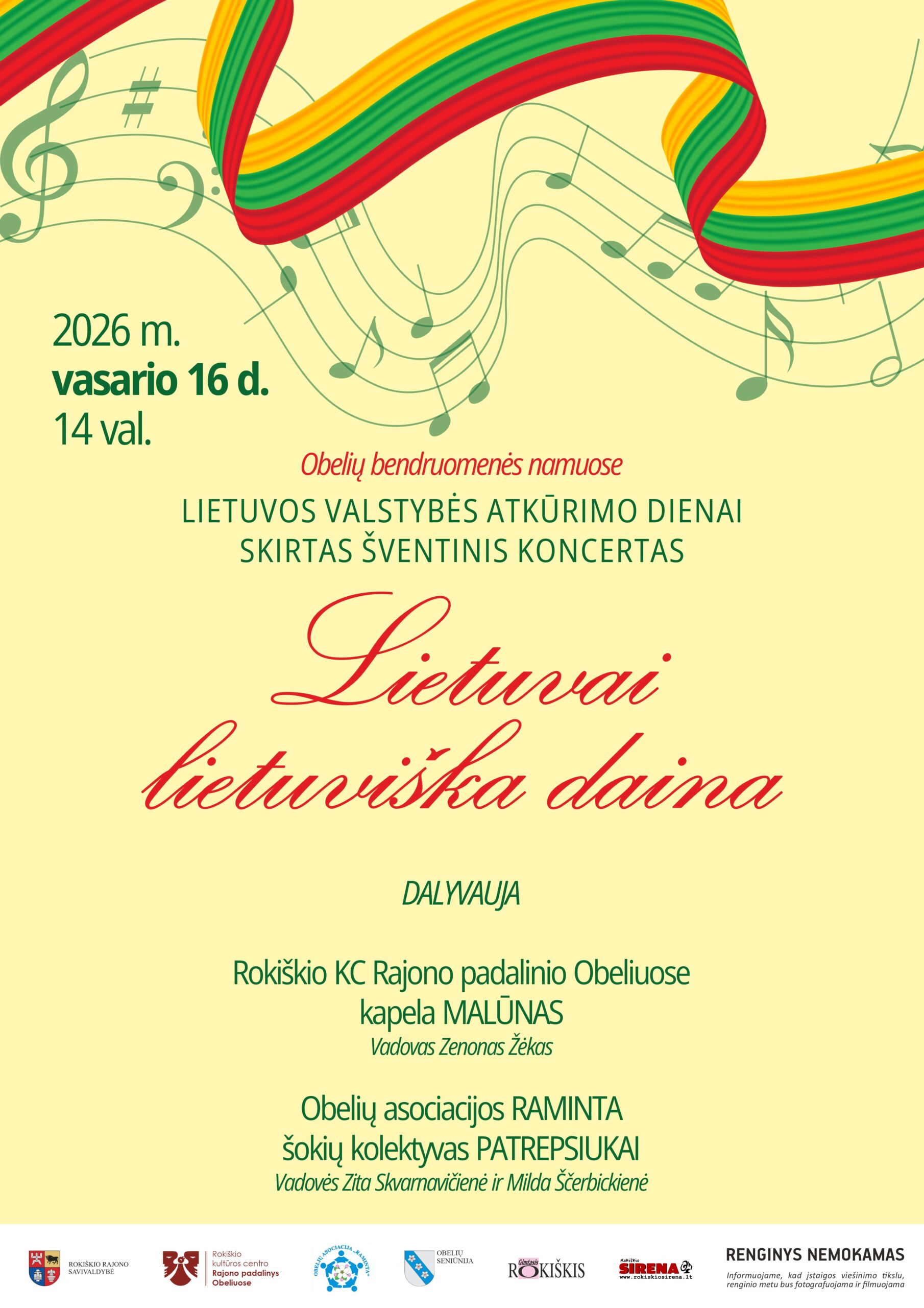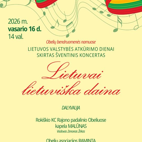 14.00 val. Šventinis koncertas „Lietuvai lietuviška daina“ Obelių bendruomenės namuose
