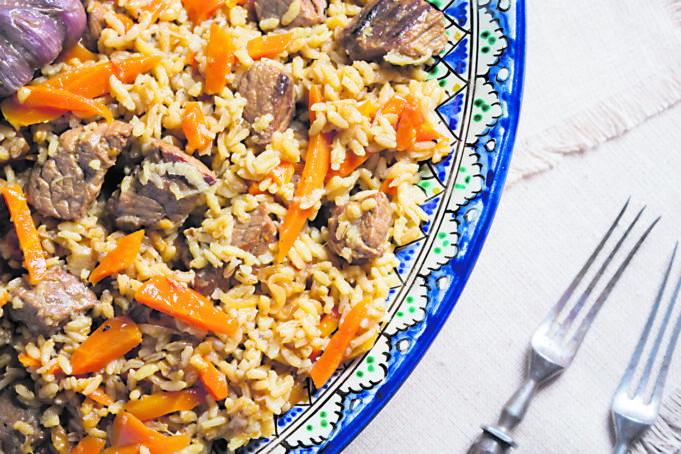 Reikės: 350 g šviežios kiaulienos, 280 g ryžių, 1 svogūno, 2-3 morkų, 1-2 lauro lapų, česnako galvutės, alyvuogių aliejaus, druskos, pipirų, malto kumino, maltos saldžiosios paprikos, malto imbiero, ciberžolės.