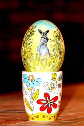 „Šiais metais ūkyje turime nemažai stručių kiaušinių“, – vardijo nesuskaičiuojamas kiaušinių rūšis pašnekovė. Stručio kiaušinius ji naudoju vietoj drobės ir ant jų tapo akriliniais dažais.