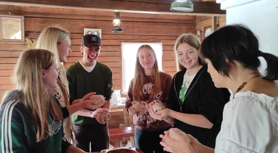 Anykščiuose buvo aplankytas Angelų muziejus. Dalyviai ne tik susipažino su nuostabiais meno kūriniais, bet ir patys pabandė atlikti muzikinius kūrinius bei pašnibždėti angelui savo norus. Graži ta mūsų Lietuva… Jos gamtos peizažais gėrėjomės nuo Šv. Mato bažnyčios bokšto, Lajų take ir nuo Kalitos kalno… Projekto dalyvius iš Turkijos, Latvijos ir Slovakijos sužavėjo senieji lietuvių amatai bei duonos kepimo edukacija Niūronių kaimo troboje. Nors ir kokie sotūs buvo tradiciniai pietūs, dauguma laužė savo išsikeptos duonelės kepaliuko kampą ir mėgavosi dar šilta duonele. Sugrįžtant į Rokiškį autobuse skambėjo dalyvių dainuojamos dainos ir juokas…