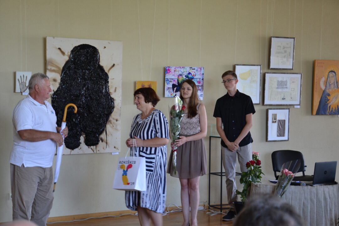 Čia eksponuojami ne tik paveikslai, bet ir architektūros, dizaino projektai ir objektai, mažoji skulptūra. Į renginį iš Kėdainių rajono, kur dabar gyvena, atvažiavo mokyklos įkūrėjas Stasys Dovydas. Dalydamasis prisiminimais, jis taip susigraudino, kad kalbą teko nukelti. Šios parodos – kaip pagrindinio gimtadienio akcento – iniciatorius yra dailininkas ir mokytojas Raimondas Gailiūnas. Jis pristatė parodos koncepciją, pasakojo, kaip buvusių mokinių ieškojo per feisbuką. Paroda Rokiškio kultūros centro antrojo aukšto fojė veiks kelias savaites – joje kelių dešimčių autorių darbai.